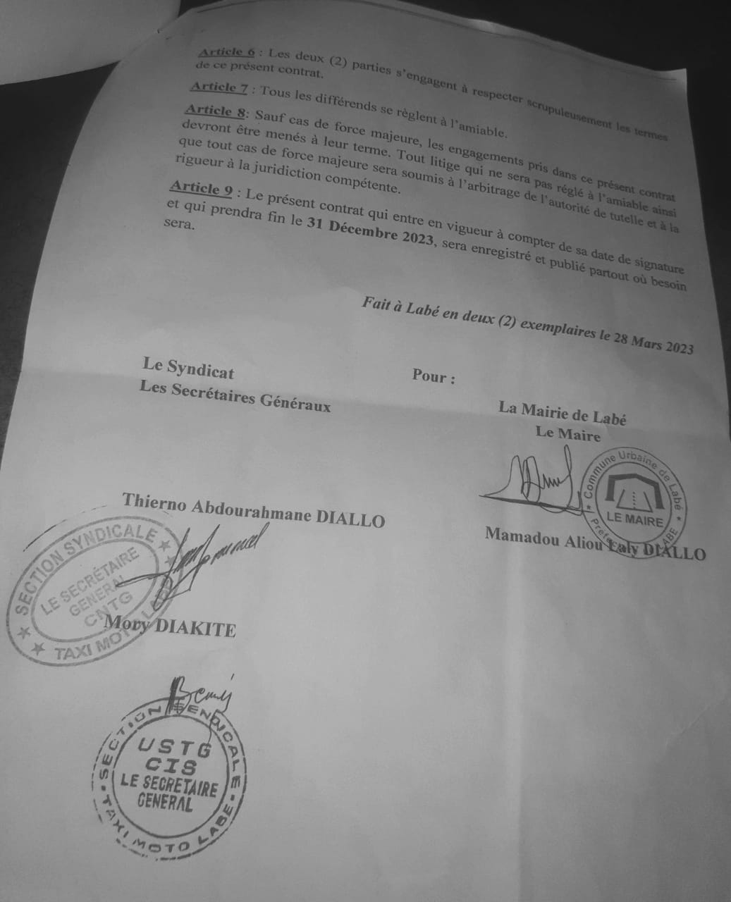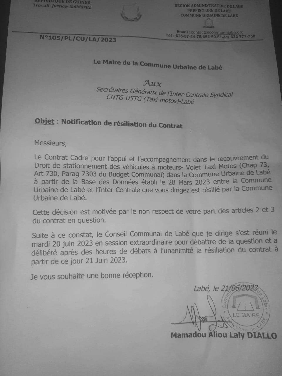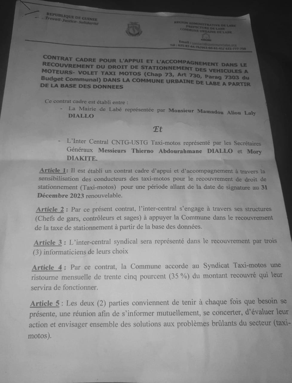 La Mairie de Labé motive cette décision par le fait que selon elle, le syndicat des taxis motos aurait violé deux points de leur accord notamment les articles 2 et 3 (voir copie du contrat).