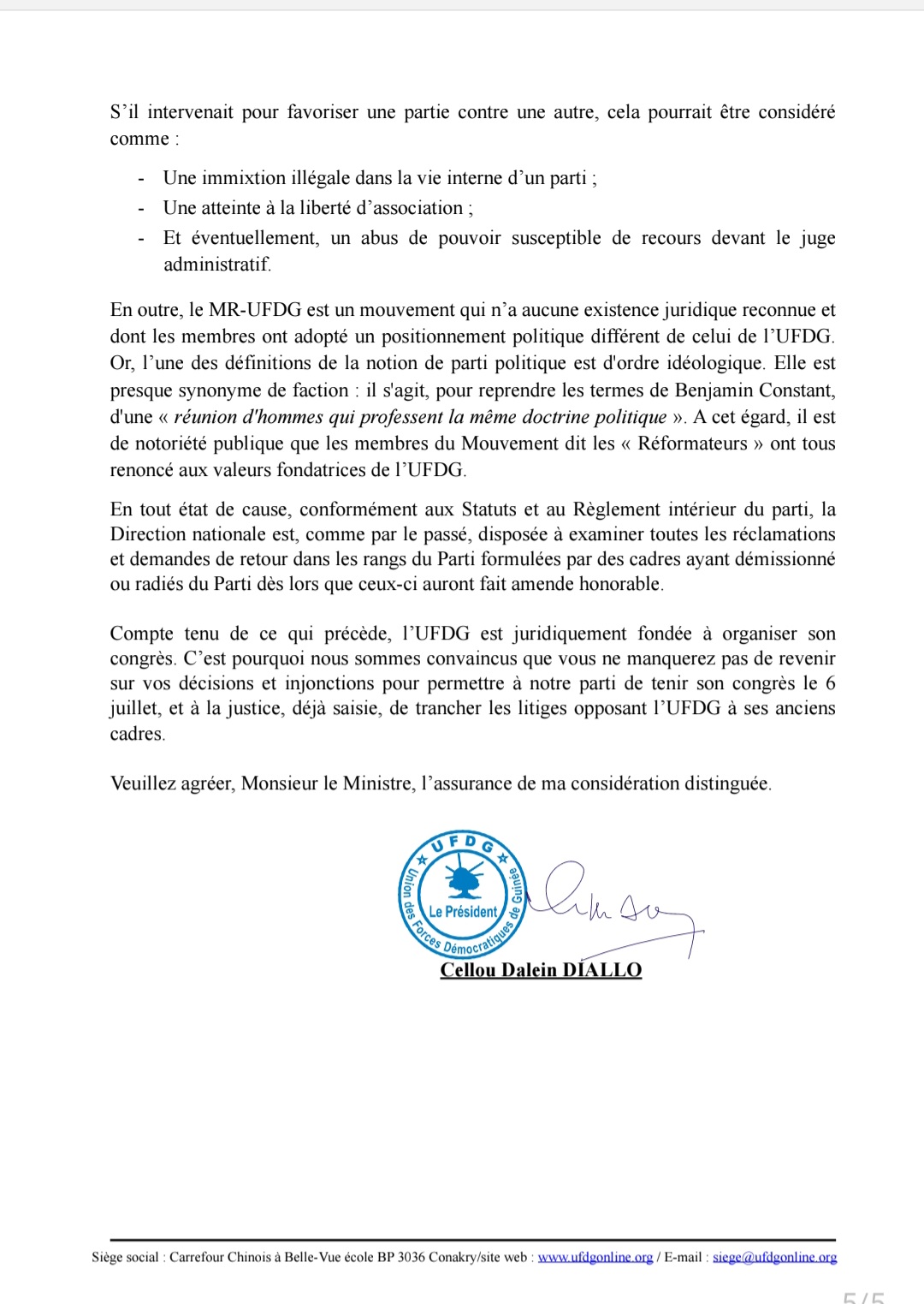 Le président de l’Union des forces démocratiques de Guinée (UFDG) a répondu au courrier du ministère de l’Administration du territoire et de la Décentralisation (MATD). Dans un courrier de cinq pages, l’ancien Premier ministre explique point par point “l’illégalité de l’action” du ministre de l’Administration du territoire et de la Décentralisation, Ibrahima Kalil Condé.
