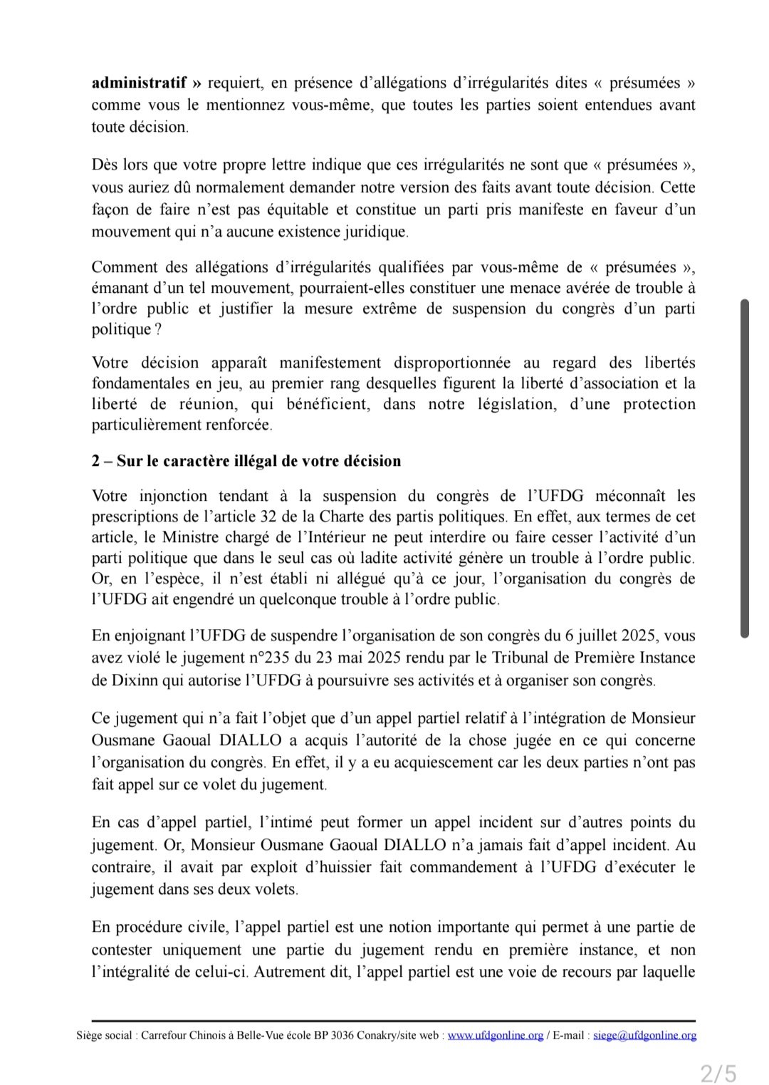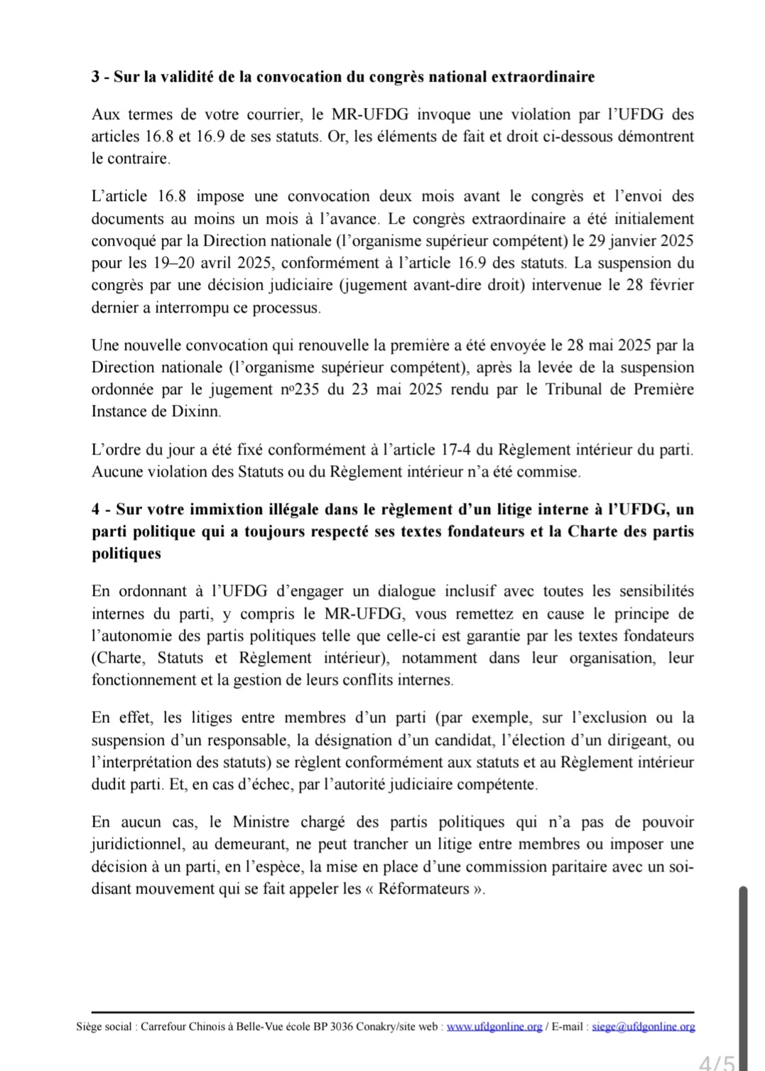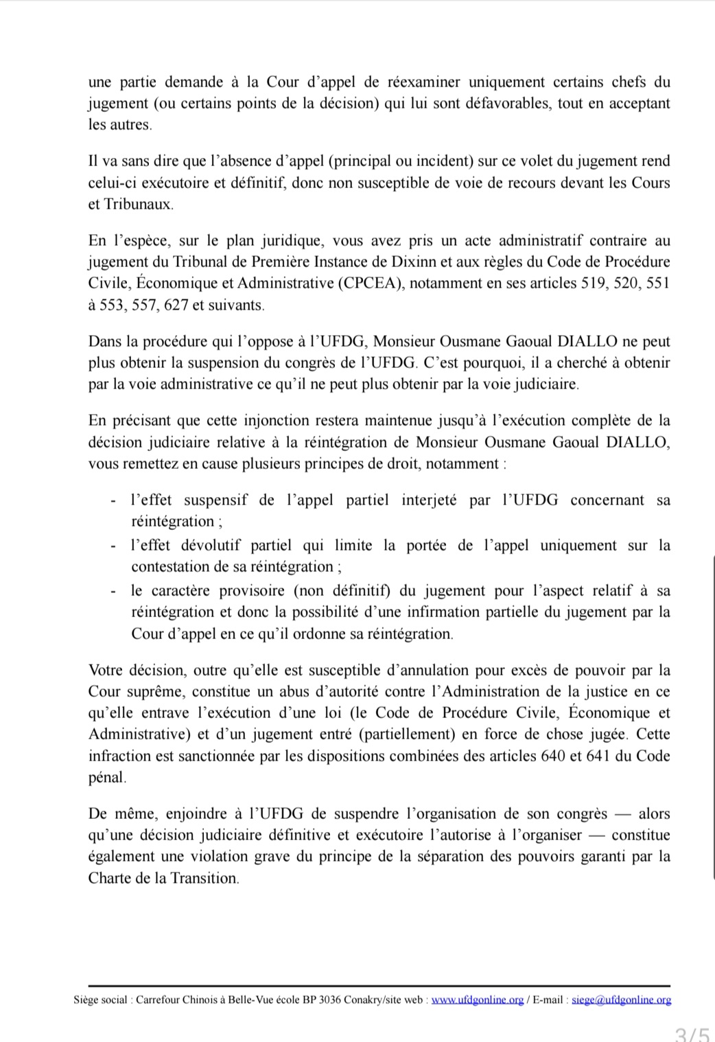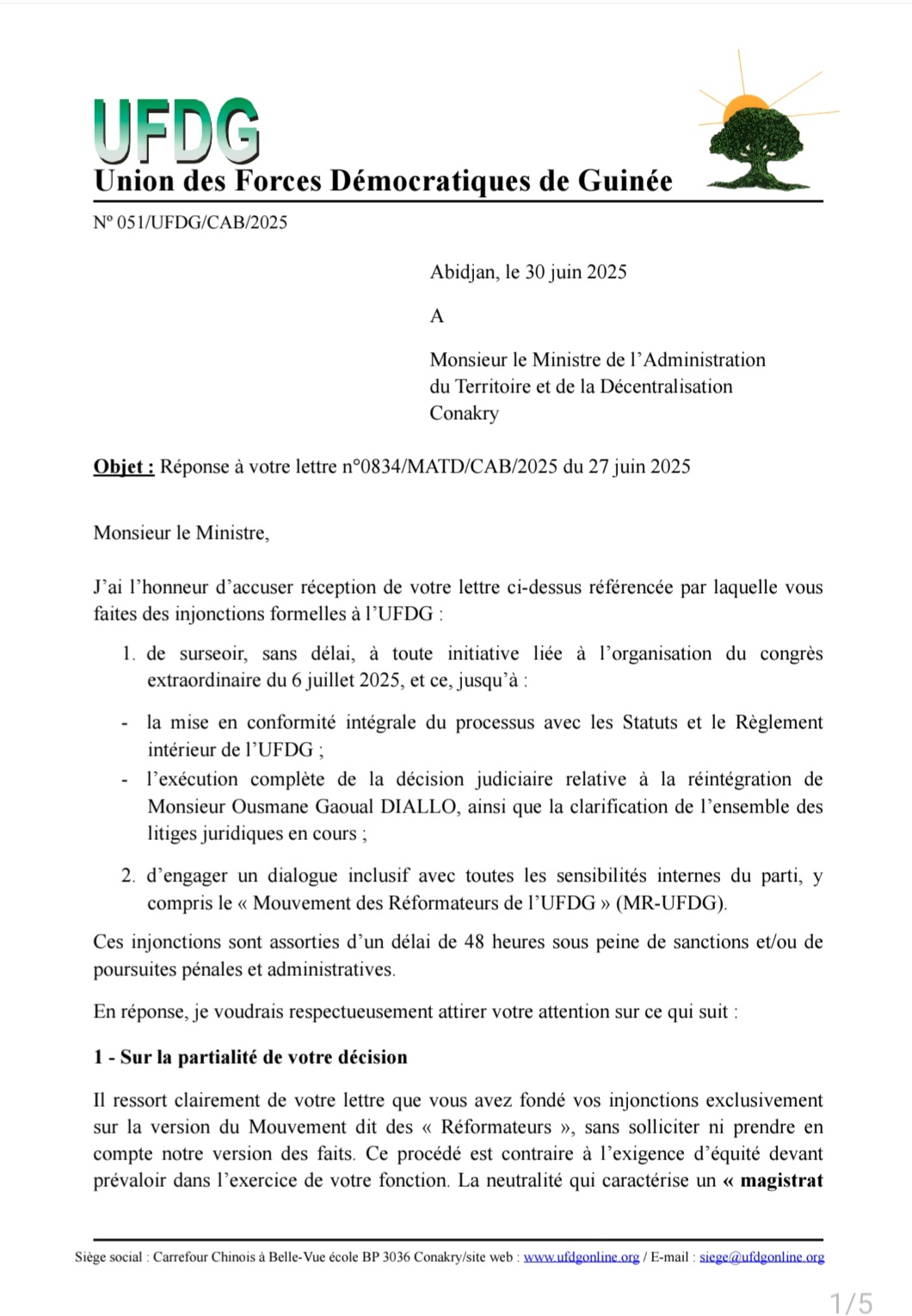 Le président de l’Union des forces démocratiques de Guinée (UFDG) a répondu au courrier du ministère de l’Administration du territoire et de la Décentralisation (MATD). Dans un courrier de cinq pages, l’ancien Premier ministre explique point par point “l’illégalité de l’action” du ministre de l’Administration du territoire et de la Décentralisation, Ibrahima Kalil Condé.