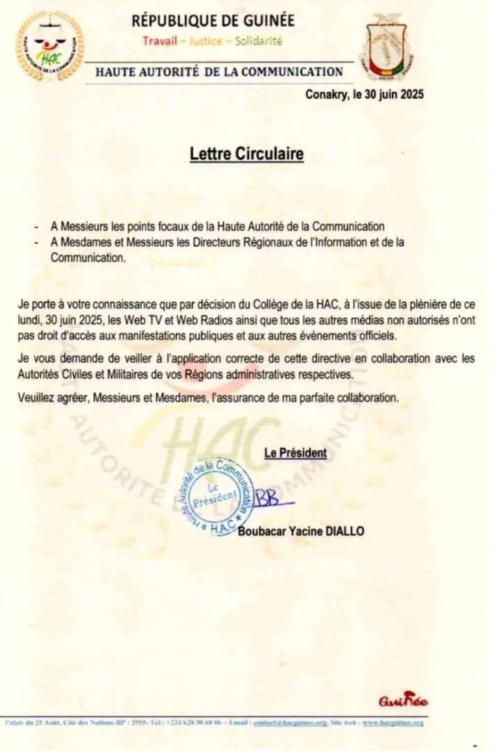 La décision, prise à l’issue de la plénière du Collège de la HAC, a été adressée aux points focaux de l’institution ainsi qu’aux directeurs régionaux de l’information et de la communication. Dans la note signée par son président, Boubacar Yacine Diallo, la H AC insiste sur la mise en œuvre stricte de cette mesure dans toutes les régions administratives du pays, en collaboration avec les autorités civiles et militaires.
