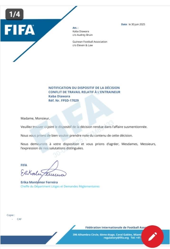 Le contentieux opposant Kaba Diawara à la Fédération guinéenne de football (FGF) connaît un premier dénouement. L’ancien sélectionneur du Syli national, qui réclamait des arriérés de salaires à l’instance dirigeante du football guinéen, a vu sa requête rejetée par le Tribunal du Football de la FIFA.