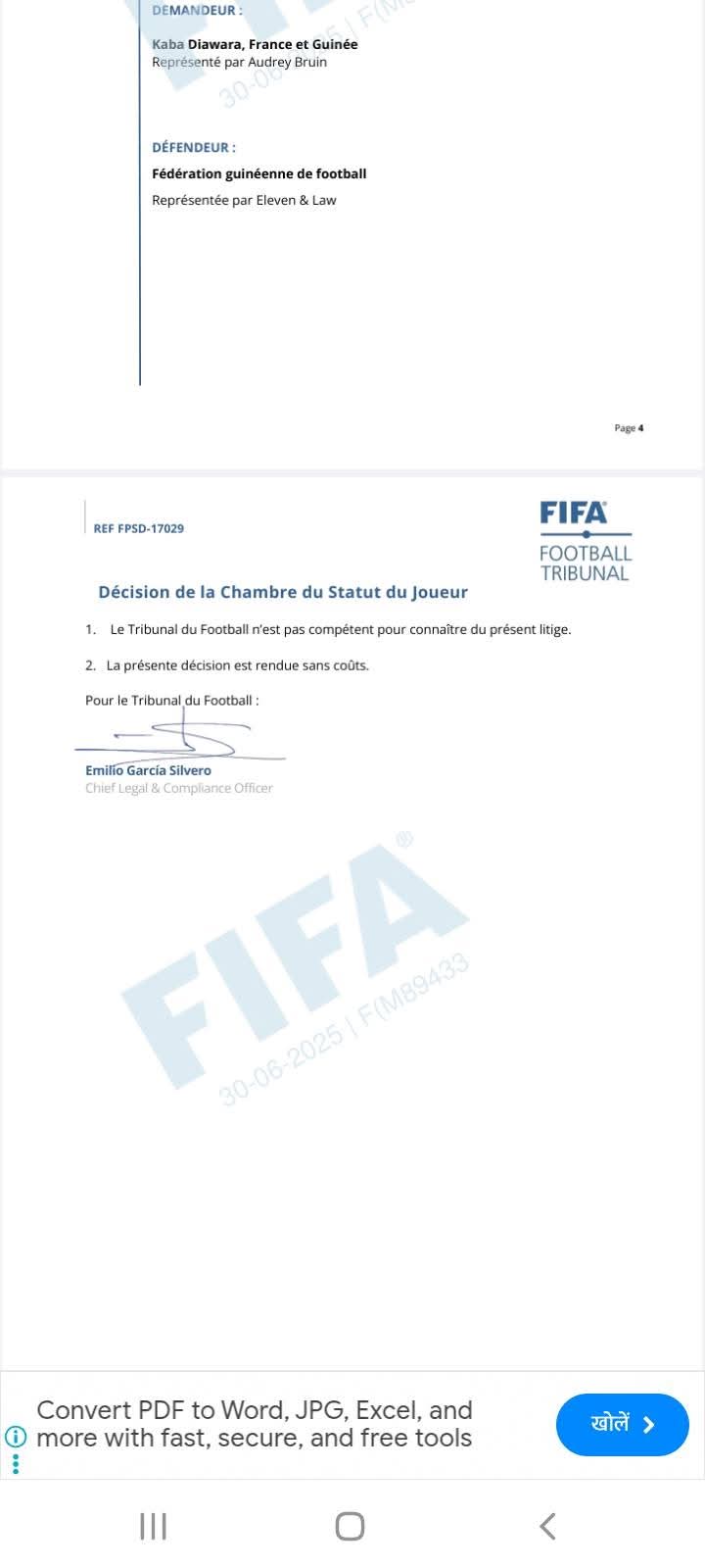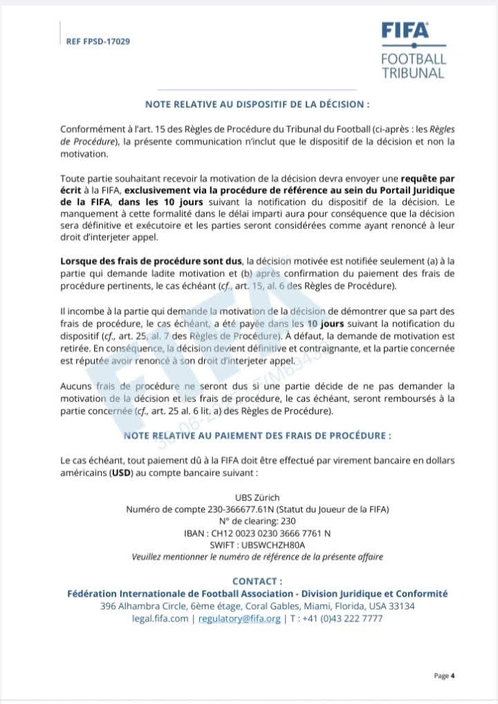 Dans une décision rendue le 24 juin 2025, la Chambre du statut du joueur s’est déclarée incompétente pour statuer sur cette affaire. Autrement dit, le litige ne relève pas de sa juridiction. La FIFA a également précisé que la décision est rendue sans frais.