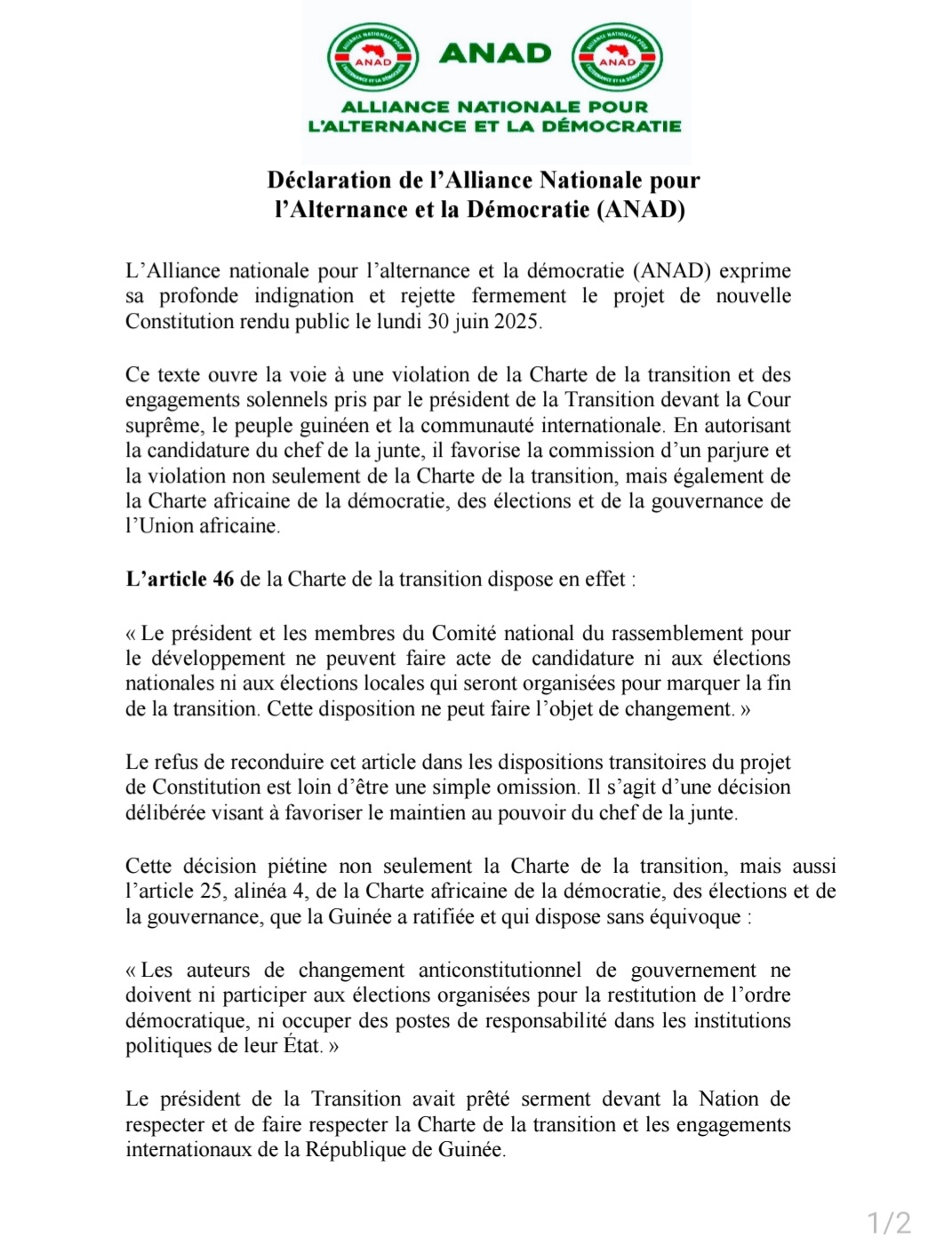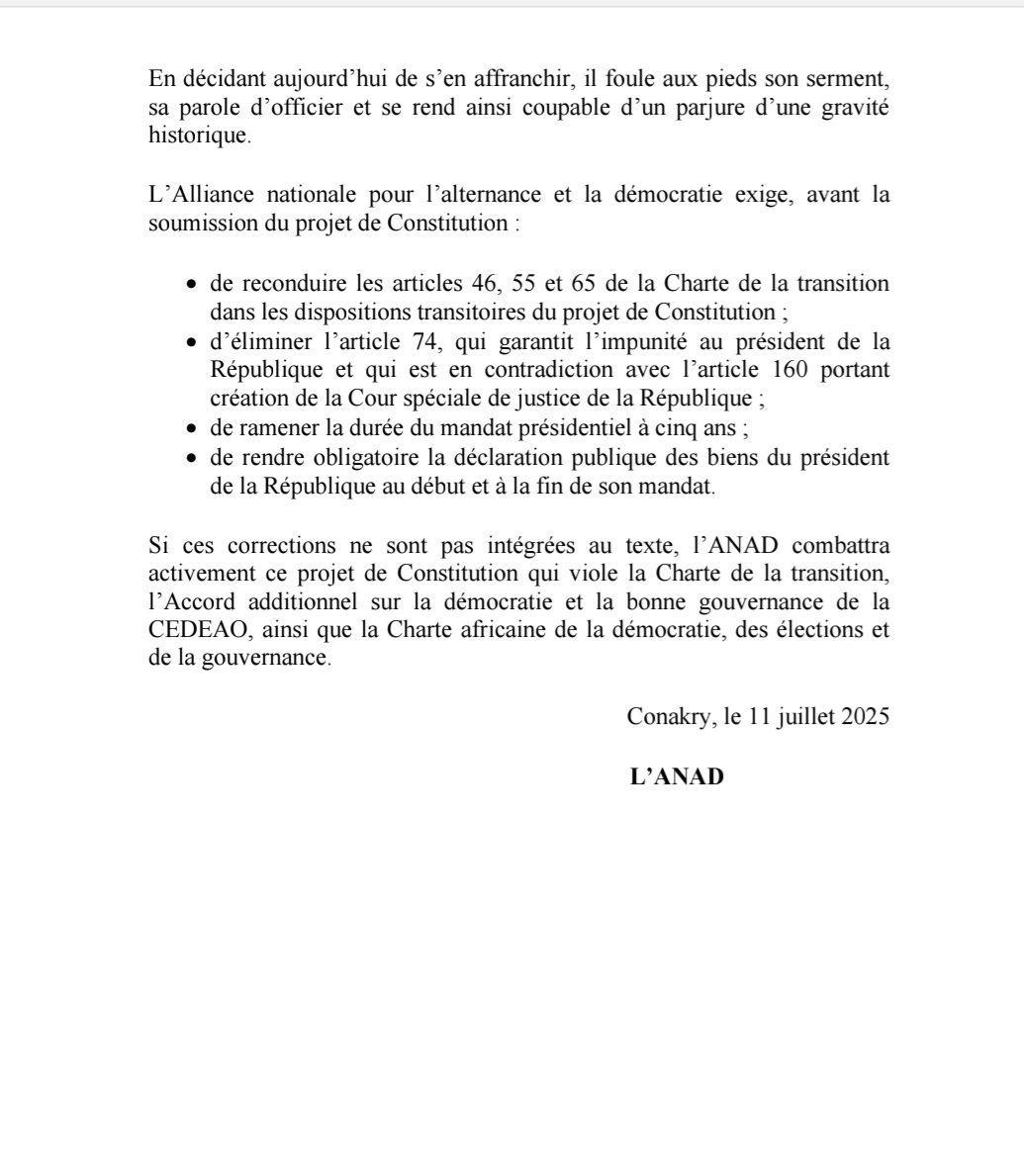 Les membres de l’Alliance nationale pour l’alternance et la démocratie (ANAD) rejettent avec la plus grande fermeté le projet de nouvelle Constitution, publié le 30 juin 2025.