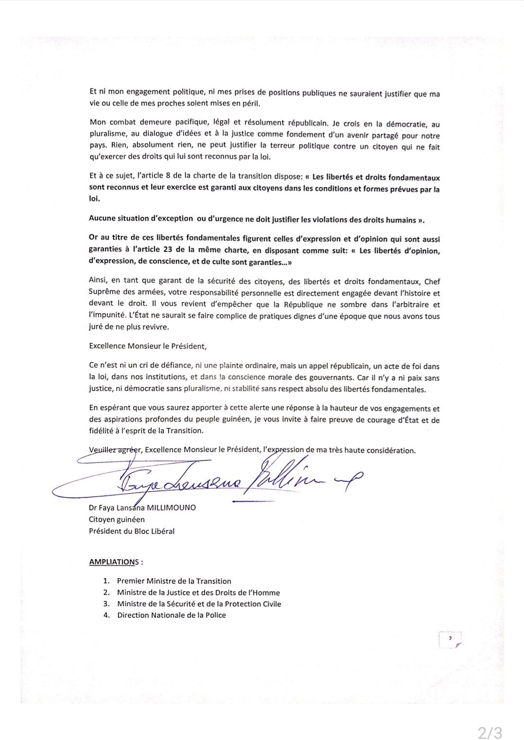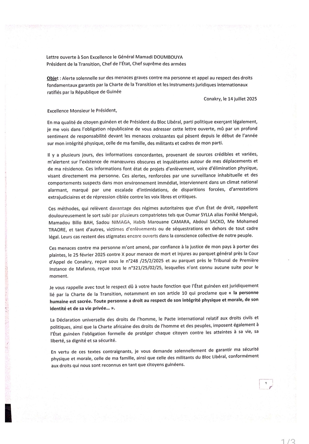 Le président du Bloc Libéral (BL) a adressé une lettre ouverte au président de la transition Général Mamadi Doumbouya. Dans cette lettre, Faya Millimouno dit faire face à des “menaces croissantes qui pèsent depuis le début de l’année sur mon intégrité physique, celle de ma famille, des militants et cadres de mon parti”.