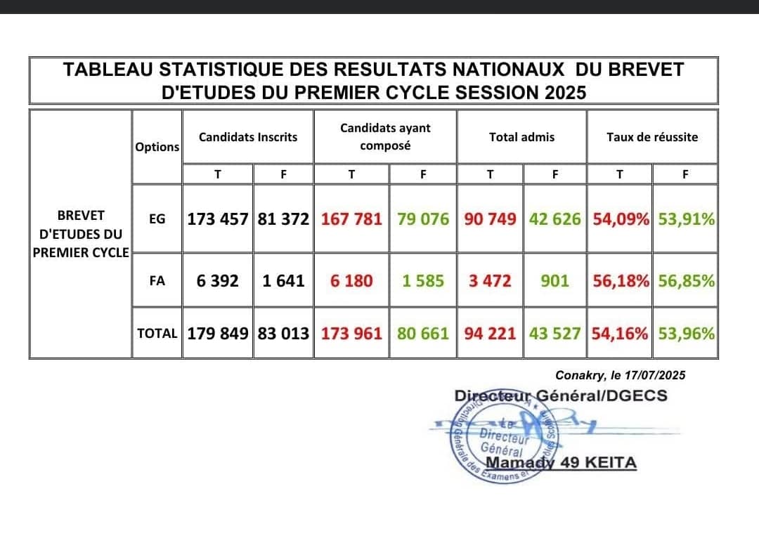 Le ministère de l’Éducation nationale, à travers la Direction générale des examens et concours scolaires (DGESCS), a rendu publiques ce jeudi 17 juillet les statistiques nationales du brevet d’études du premier cycle (BEPC) session 2025. Sur un total de 254 510 candidats inscrits, 173 961 garçons et 80 661 filles ont effectivement composé, toutes options confondues. Au final, 137 748 candidats ont été admis, soit un taux de réussite global de 54,16 % pour les garçons et de 53,96 % pour les filles.