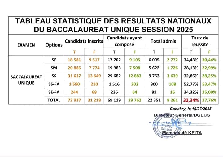 Le ministère de l’Éducation nationale, à travers la Direction générale des examens et contrôles scolaires (DGESCS), a dévoilé ce samedi les statistiques du baccalauréat unique, session 2025. Sur un total de 72 937 candidats inscrits, seuls 69 119 ont effectivement composé, parmi lesquels 22 351 ont été déclarés admis. Soit un taux de réussite national de 32,34 %.