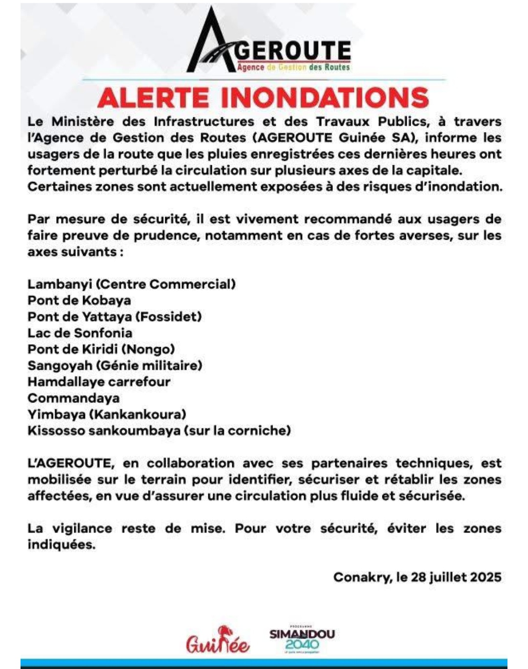 À travers un communiqué publié ce lundi 28 juillet, l’Agence de gestion des routes (AGEROUTE) a alerté sur des risques liés aux fortes précipitations qui s’abattent sur la capitale guinéenne.