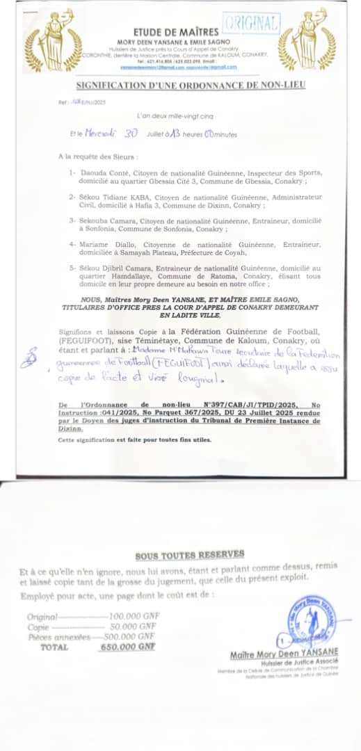 Cette ordonnance met un terme à une affaire sensible qui avait fait des vagues dans le milieu sportif guinéen. Désormais, la balle est dans le camp de la FEGUIFOOT pour statuer sur leur réintégration éventuelle.