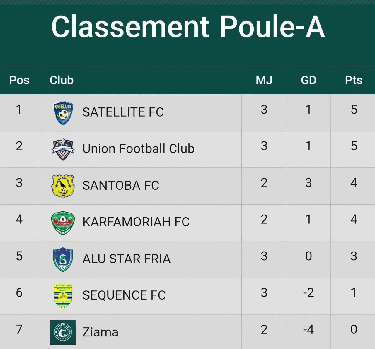 Au classement, Satellite FC et Union FC se disputent la 1ʳᵉ place avec 5 points en 3 matchs, suivis de près par Santoba et Karfamoriyah avec 4 points pris en deux matchs. Puis vient l’Aluminier de Fria avec 3 points en trois matchs. Satellite et Ziama de Macenta sont respectivement 6ᵉ et 7ᵉ avec un point pour l’équipe de Dixinn et 0 pour l’Aigle Vert.