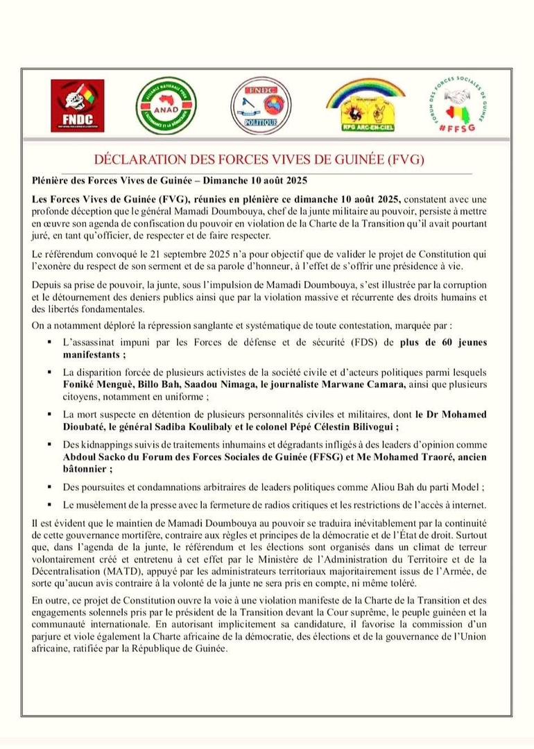 À l’issue d’une plénière tenue dimanche 10 août 2025, les forces vives de Guinée (FVG) disent avoir constaté avec une profonde « déception » des velléités de « confiscation du pouvoir » par le Gal Doumbouya en « violation de la Charte de la transition qu’il avait pourtant juré, en tant qu’officier, de respecter et de faire respecter ».