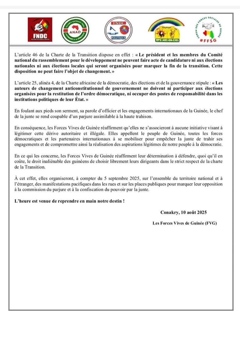 Pour faire, “elles organiseront, à compter du 5 septembre 2025, sur l’ensemble du territoire national et à l’étranger, des manifestations pacifiques dans les rues et sur les places publiques pour marquer leur opposition à la commission du parjure et à la confiscation du pouvoir par la junte”.