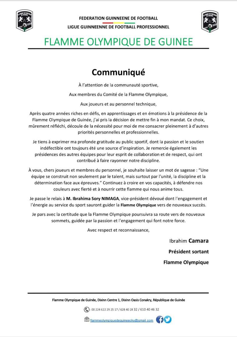 Coup de tonnerre au sein de la Flamme olympique. Après quatre années à la tête du club, M. Ibrahima Camara a annoncé sa démission de la présidence dans un communiqué publié sur les différentes plateformes du club. Une décision qu’il justifie par la volonté de se consacrer davantage à ses activités personnelles et professionnelles.