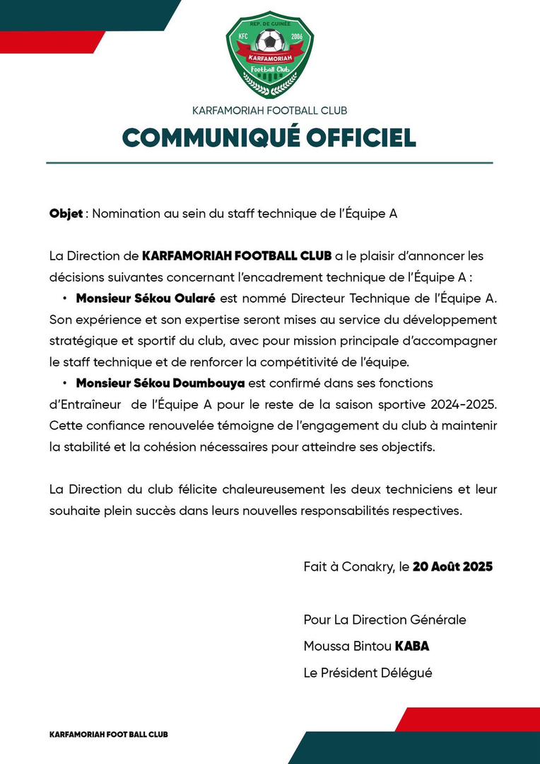 Le Karfamoriah Football Club a tranché : Sékou Doumbouya est confirmé entraîneur principal de l’équipe A pour la suite de la saison 2024-2025. La décision a été officialisée ce mercredi 20 août 2025 dans un communiqué signé par le président délégué, Moussa Bintou Kaba.