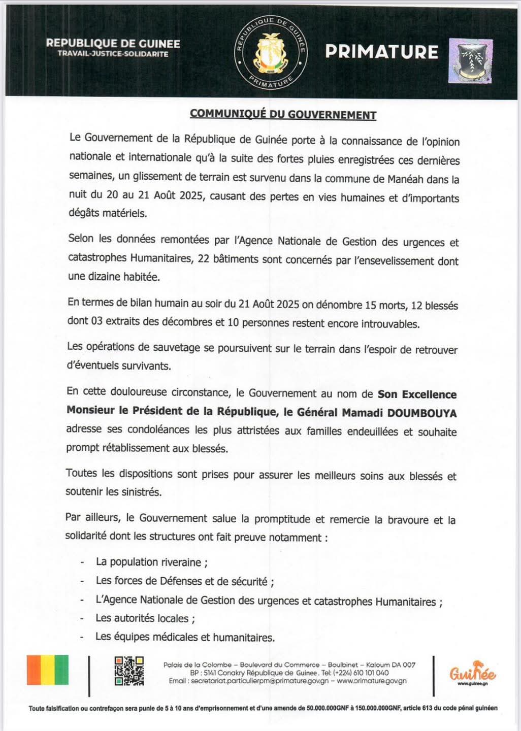 Les opérations de sauvetage se poursuivent sur le terrain dans l’espoir de retrouver d’éventuels survivants. Dans ce contexte tragique, le gouvernement, au nom du président de la République, le général Mamadi Doumbouya, a adressé ses condoléances aux familles endeuillées et souhaité prompt rétablissement aux blessés.