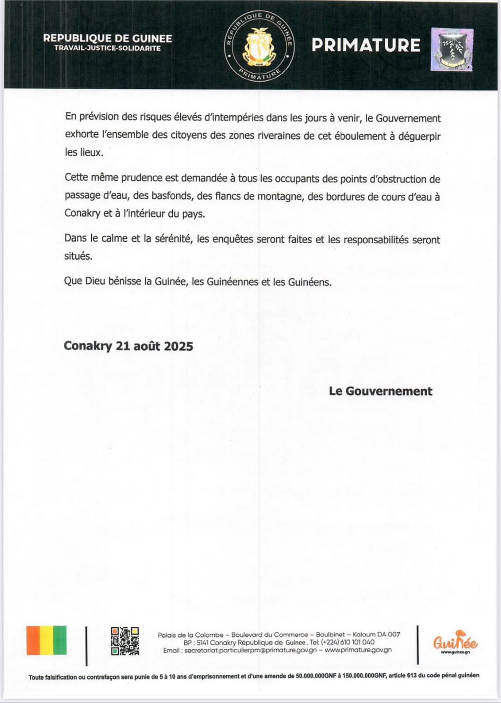 Face aux risques accrus d’intempéries dans les jours à venir, le gouvernement exhorte les citoyens des zones riveraines de l’éboulement à évacuer les lieux immédiatement. Il recommande également la prudence aux habitants vivant près des points d’obstruction d’eau, des bas-fonds, des flancs de montagne et des cours d’eau à Conakry et dans l’intérieur du pays.