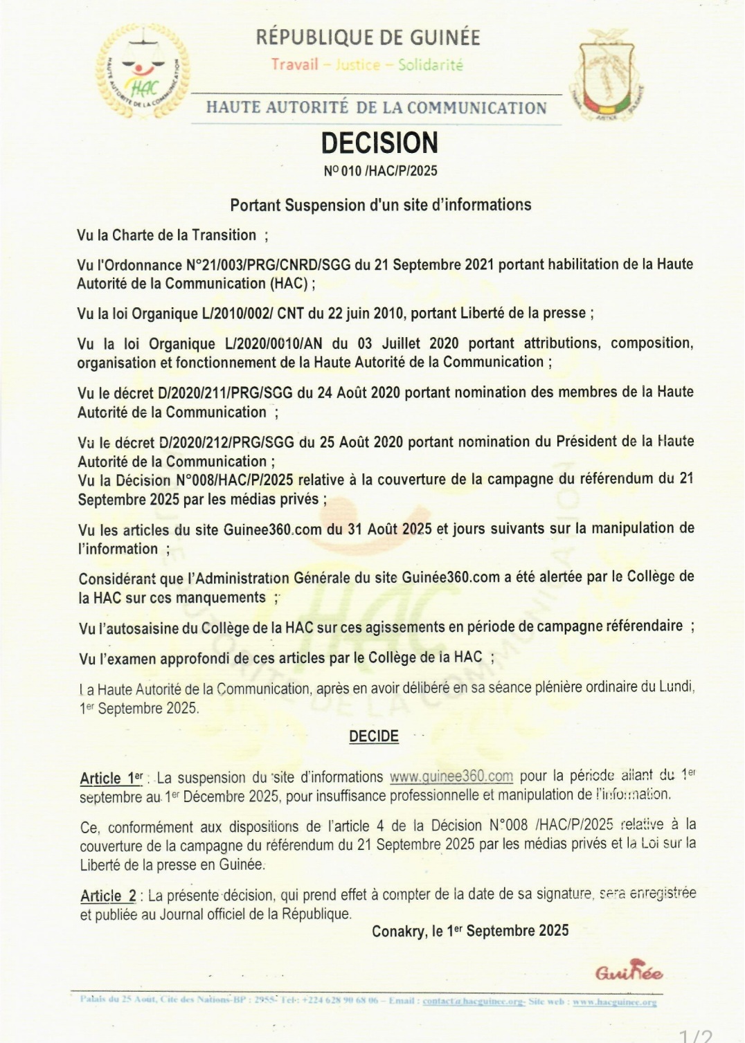 Dans une décision prise ce 1ᵉʳ septembre 2025, la Haute Autorité de la communication a suspendu le site d’information générale www.guinee360.com “pour la période allant du 1ᵉʳ septembre au 1ᵉʳ décembre 2025. Il est reproché au média d’“insuffisance professionnelle et de manipulation de l’information”.