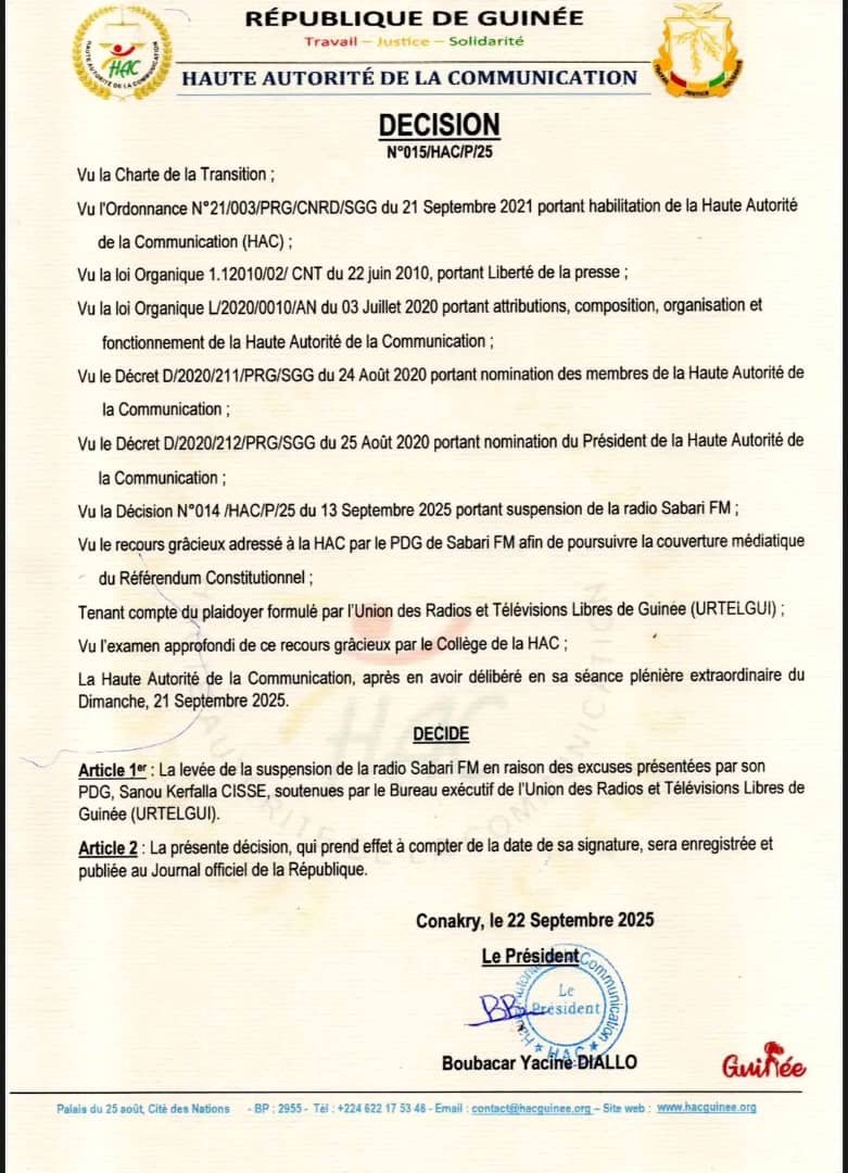 La suspension de la radio Sabari FM a été levée ce lundi 22 septembre 2025 par la Haute Autorité de la communication (HAC). Selon la décision, cette décision est due à “des excuses présentées par son PDG, Sanou Kerfalla Cissé, soutenues par le Bureau exécutif de l’Union des Radios et Télévisions Libres de Guinée (URTELGUI)”.