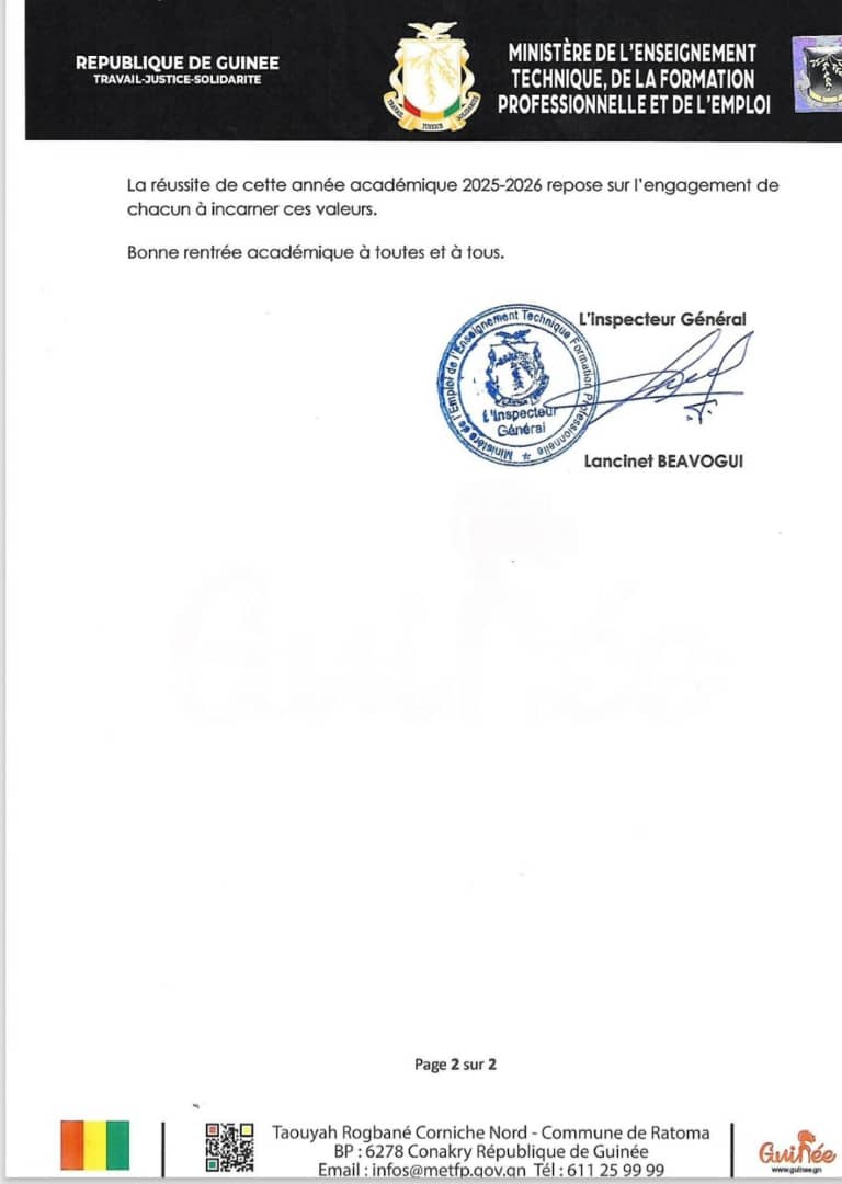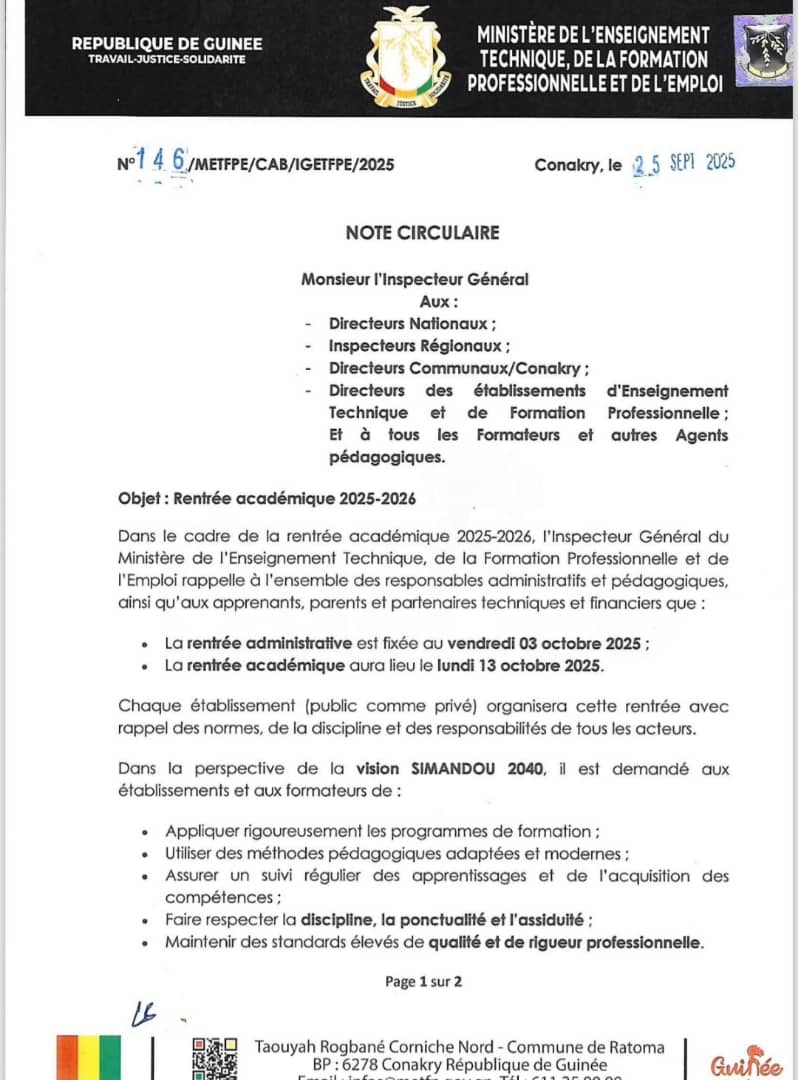 À l’orée de la rentrée académique 2025-2026, le Ministère de l’Enseignement Technique, de la Formation Professionnelle et de l’Emploi fixe le cap : discipline, professionnalisme et qualité. Dans le cadre de la vision SIMANDOU 2040, tous les établissements, formateurs, et acteurs de la formation sont appelés à redoubler d’efforts pour garantir une année placée sous le signe de l’excellence et de la performance.