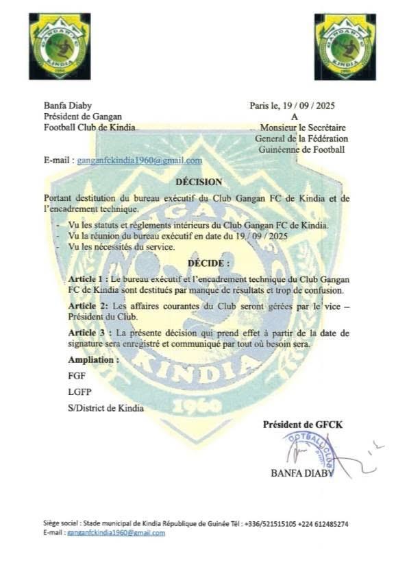Le président du Gangan Football Club de Kindia, Banfa Diaby, a annoncé la dissolution du bureau exécutif et de l’encadrement technique du club, par décision en date du 19 septembre mais publiée ce Dimanche 12 Octobre sur les réseaux du club.