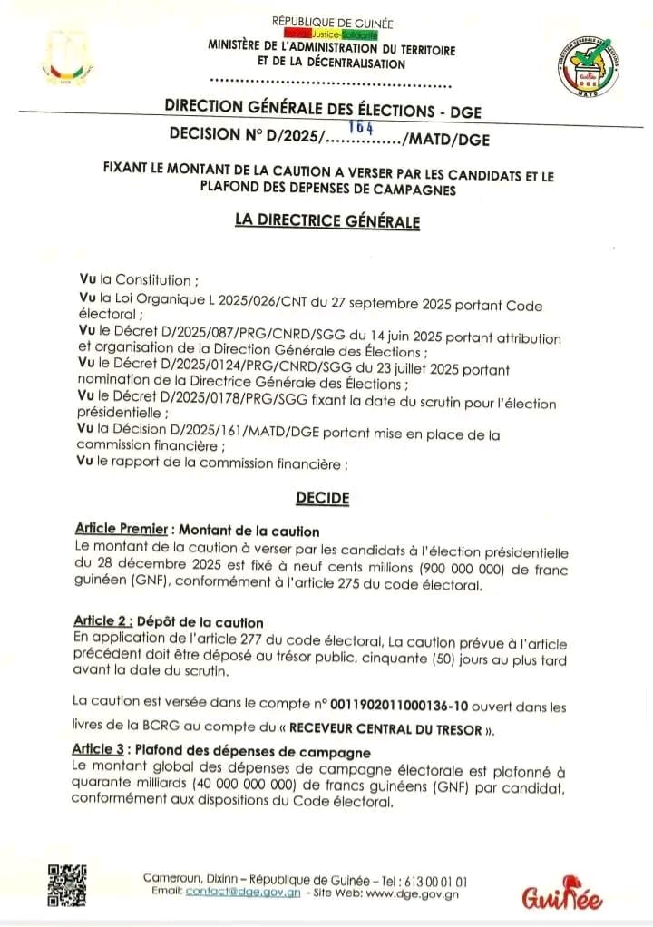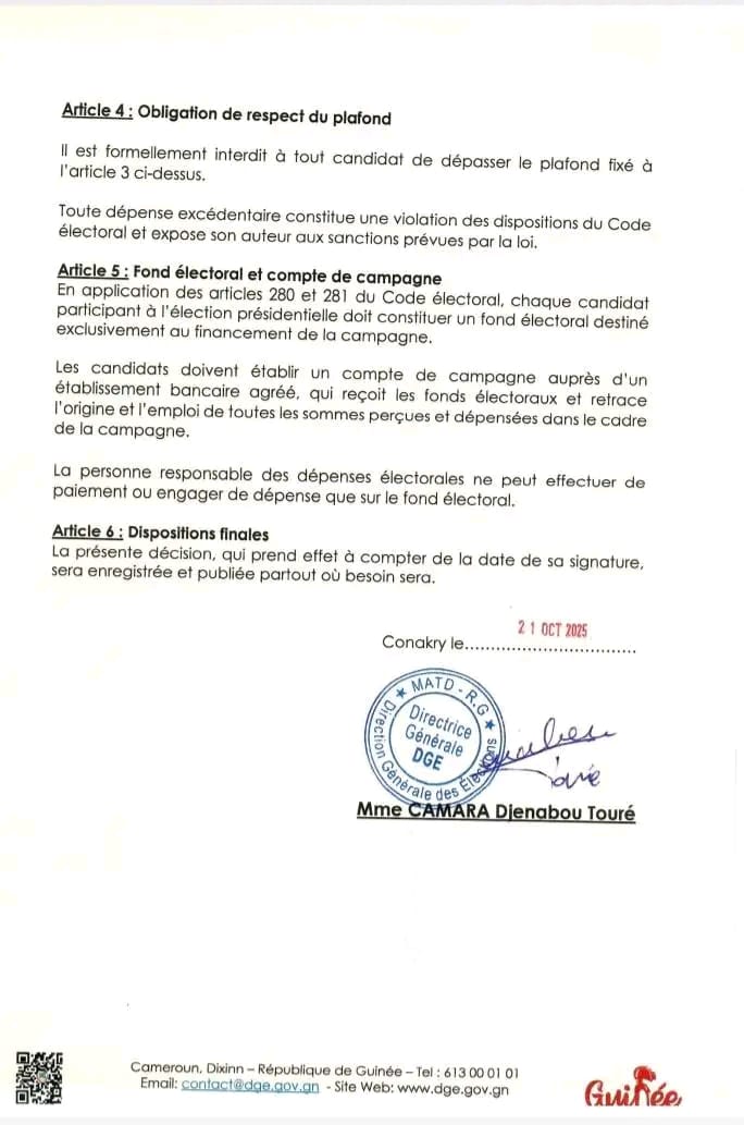 Par ailleurs, l’article 3 de la même décision précise que le plafond des dépenses de campagne est fixé à 40 milliards de GNF pour chaque candidat.