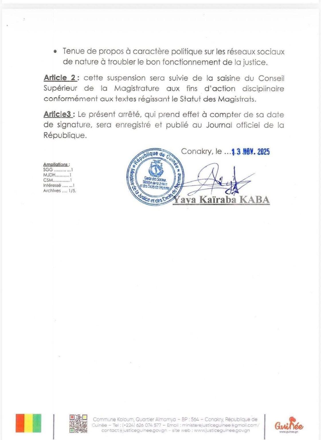 Le garde des Sceaux, ministre de la Justice et des Droits de l’Homme, Yaya Kaïraba Kaba a suspendu un magistrat en service au tribunal pour enfants. Il s’agit de Kaman Gogana Konomou, matricule 588530N, juge d’instruction au sein dudit Tribunal.