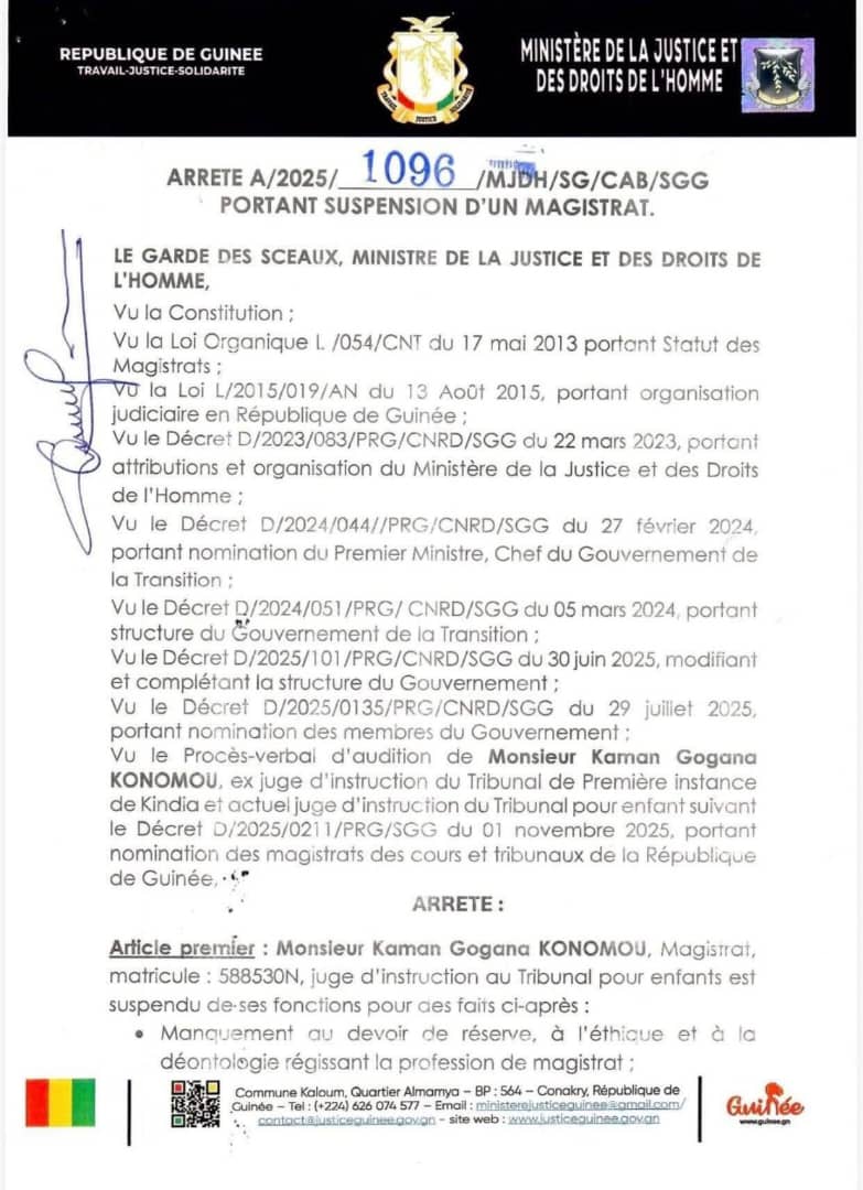 Le garde des Sceaux, ministre de la Justice et des Droits de l’Homme, Yaya Kaïraba Kaba a suspendu un magistrat en service au tribunal pour enfants. Il s’agit de Kaman Gogana Konomou, matricule 588530N, juge d’instruction au sein dudit Tribunal.