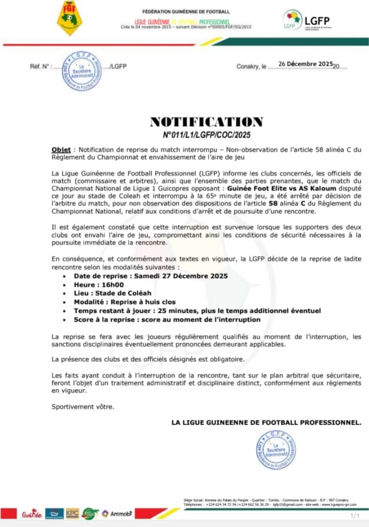 Après examen de la situation la LGFP a décidé, que le match reprendra cre samedi 27 décembre 2025, à partir de 16h00, au stade de Coléah. Cette reprise se déroulera à huis clos, afin d’éviter tout nouvel incident.