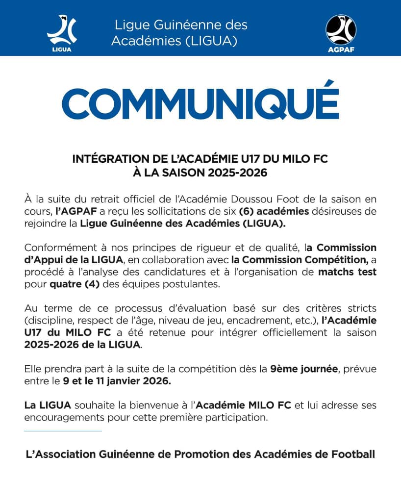 La Ligue Guinéenne des Académies de Football (LIGUA) a officialisé, ce samedi, l’entrée de l’équipe U17 du Milo FC dans la saison 2025-2026 en cours. Cette décision fait suite au retrait de l’Académie Doussou Foot, survenu après huit journées de compétition.