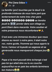 Dans une publication empreinte d’émotion et de douleur, faite sur Facebook, Grâce Zena Pivi, fille de feu Jean-Claude Pivi, a informé l’opinion publique que l’enterrement de son père aura lieu ce vendredi 23 janvier, dans son village natal.