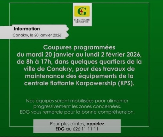 La société Électricité de Guinée (EDG) informe les populations de Conakry que des coupures d’électricité sont programmées du mardi 20 janvier au lundi 2 février 2026, entre 8 heures et 17 heures, dans certains quartiers de la capitale.