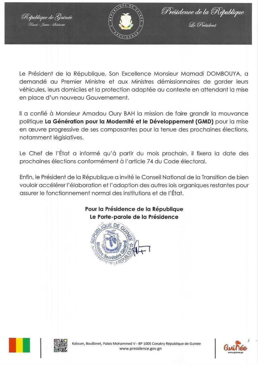 « Il a confié à Monsieur Amadou Oury BAH la mission de faire grandir la mouvance politique La Génération pour la Modernité et le Développement (GMD) pour la mise en cœuvre progressive de ses composantes pour la tenue des prochaines élections, notamment législatives. », indique le compte rendu du Conseil des ministres tenu ce jeudi 22 janvier 2026.