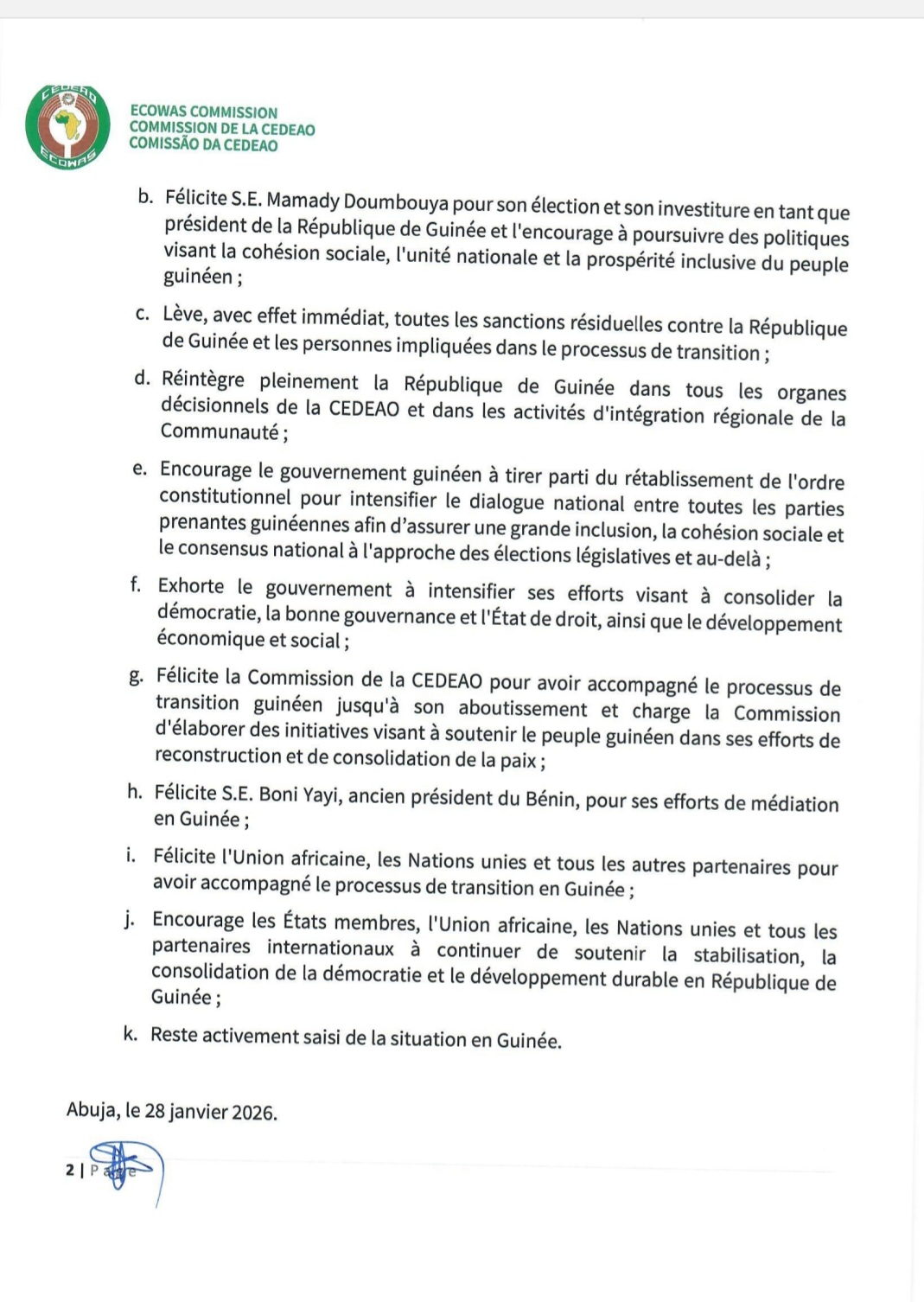 La CEDEAO a félicité le peuple guinéen ainsi que le président élu, Mamady Doumbouya, investi le 17 janvier 2026, l’encourageant à promouvoir la cohésion sociale, l’unité nationale et une gouvernance inclusive. En conséquence, la Guinée est pleinement réintégrée dans tous les organes décisionnels de la CEDEAO et dans les mécanismes d’intégration régionale.