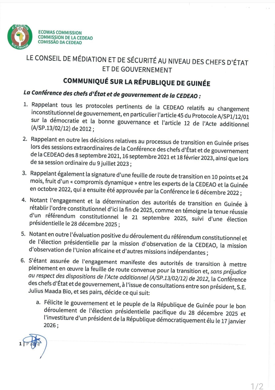 La CEDEAO a félicité le peuple guinéen ainsi que le président élu, Mamady Doumbouya, investi le 17 janvier 2026, l’encourageant à promouvoir la cohésion sociale, l’unité nationale et une gouvernance inclusive. En conséquence, la Guinée est pleinement réintégrée dans tous les organes décisionnels de la CEDEAO et dans les mécanismes d’intégration régionale.
