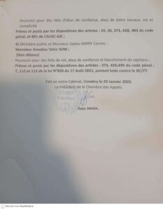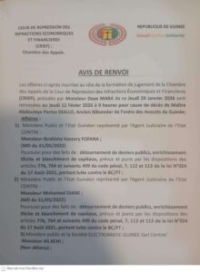 L’avis de renvoi, émis par la chambre présidée par Monsieur Daye Mara, stipule que les audiences prévues ce jeudi 29 janvier sont reportées au jeudi 12 février 2026 à 9 heures. Ce report est motivé par « le décès de Maître Abdoulaye Portos DIALLO, Ancien Bâtonnier de l’ordre des Avocats de Guinée ». Cette décision judiciaire témoigne du respect de l’institution pour la mémoire d’une personnalité qui a marqué la profession d’avocat en Guinée.