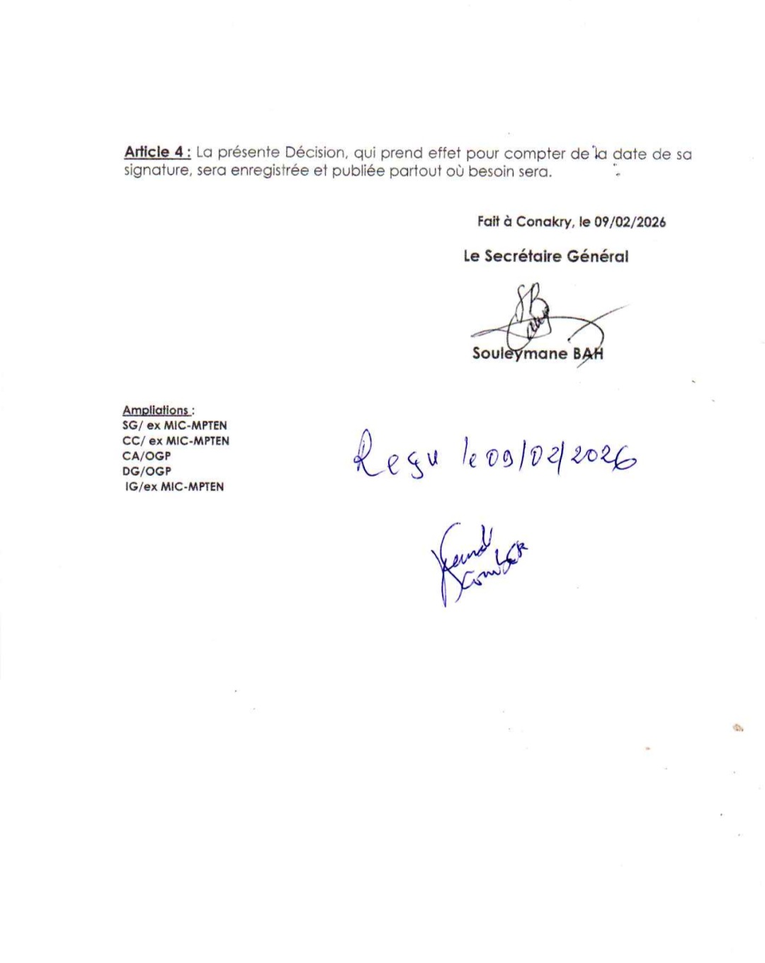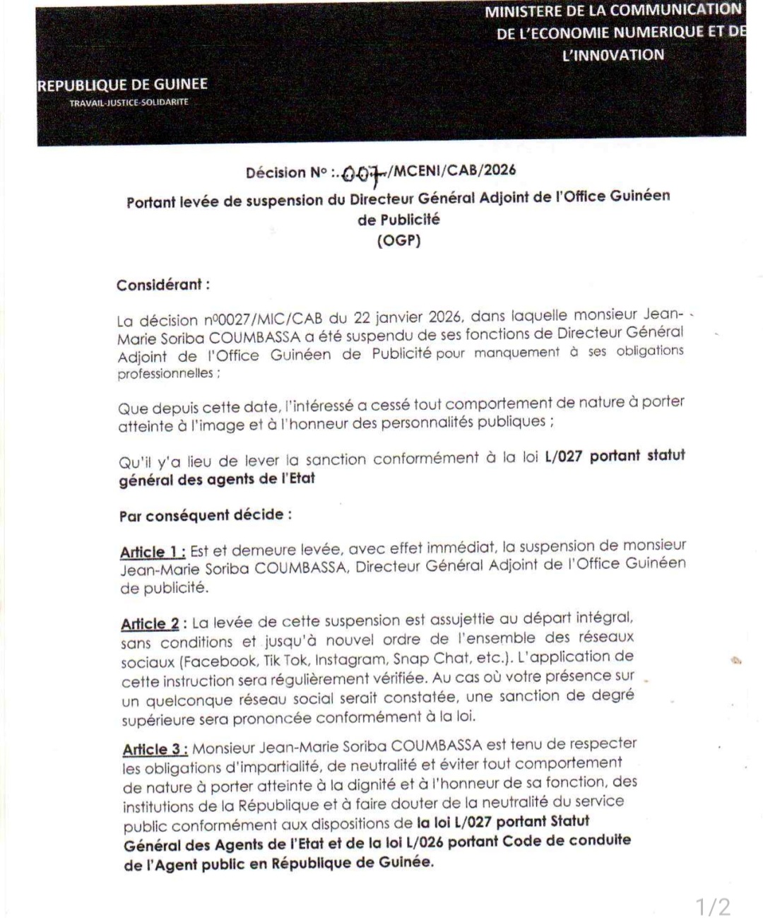 La suspension de Monsieur Jean-Marie Soriba COUMBASSA, Directeur Général Adjoint de l’Office Guinéen de Publicité, est levée avec effet immédiat conformément à la loi L/027.