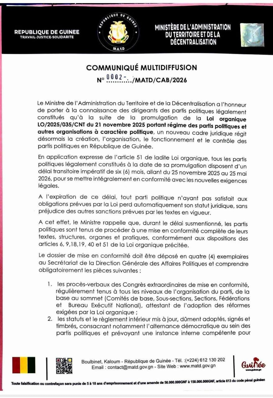 Le Ministre de I’Administration du Teritoire et de la Décentralisation invite l’ensemble des partis politiques à se conformer à la nouvelle loi organique LO/2025/035/CNT du 21 novembre 2025 portant régime des partis politiques et autres organisations à caractère politique. Pour cela, Ibrahima Kalil Condé les demandes de poser un certain nombre de dossiers au secrétariat de la Direction Générale des Affaires Politiques.