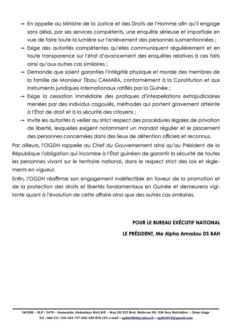 L’Organisation Guinéenne de Défense des Droits de l’Homme et du Citoyen (OGDH) affirme avoir appris, avec une profonde préoccupation et une vive indignation, l’enlèvement de membres de la famille de l’ancien ministre de la République, Tibou Kamara.