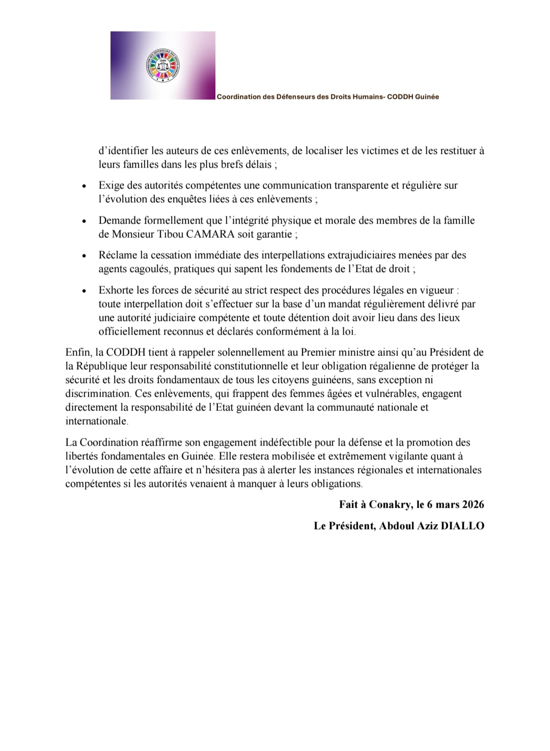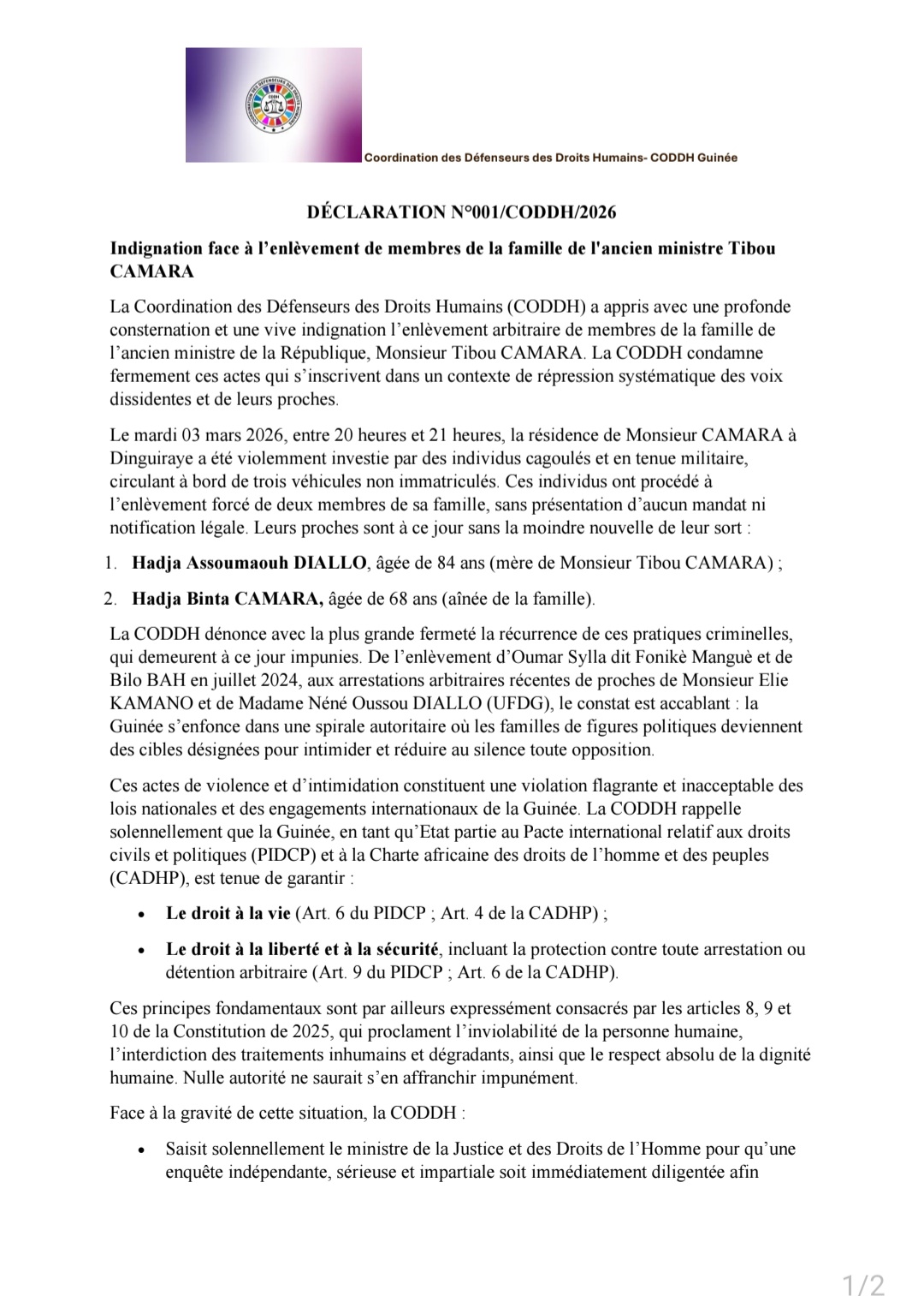 La Coordination des Défenseurs des Droits Humains (CODDH) s’indigne suite à l’enlèvement des membres de la famille de Tibou Kamara. “La CODDH condamne
