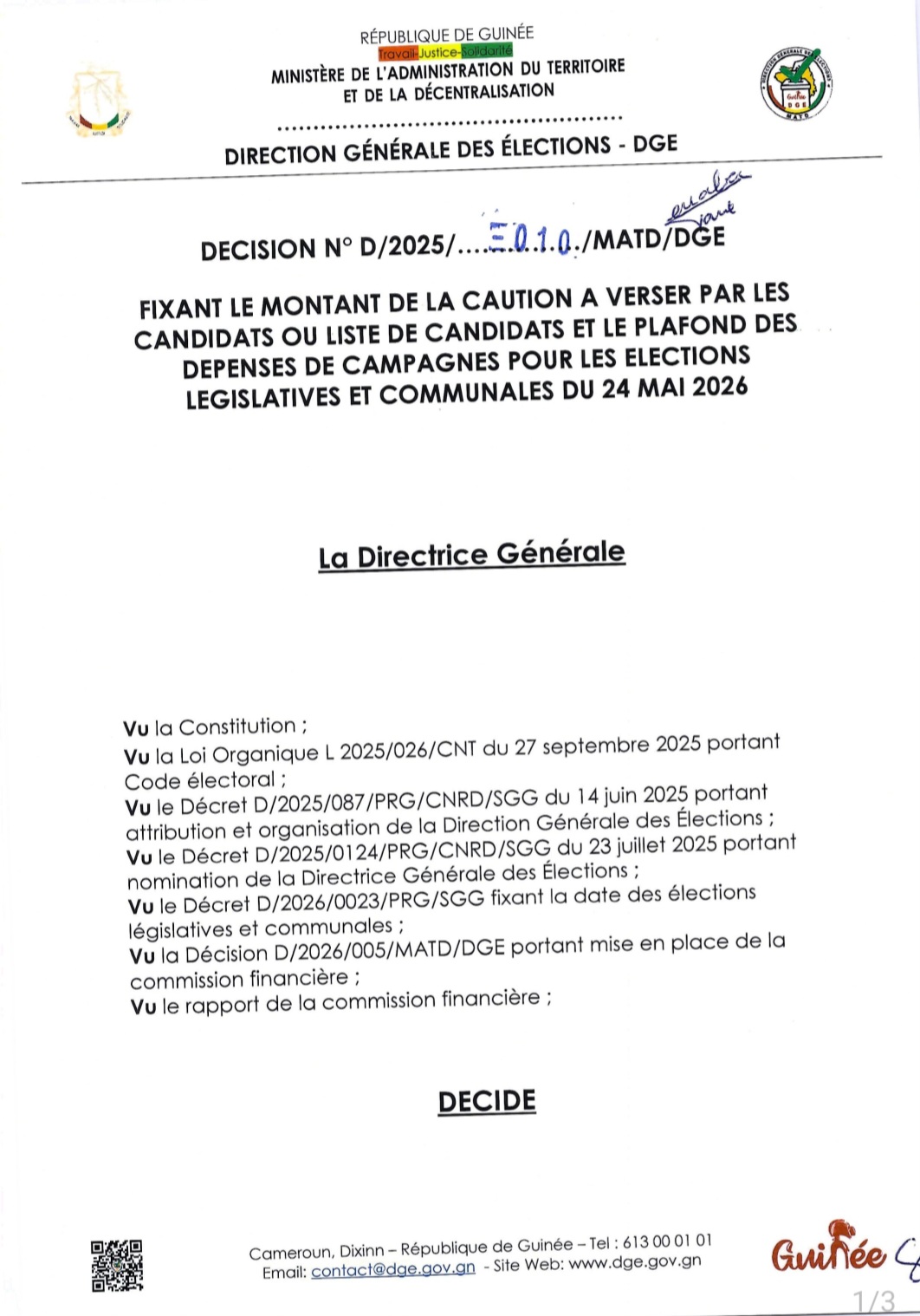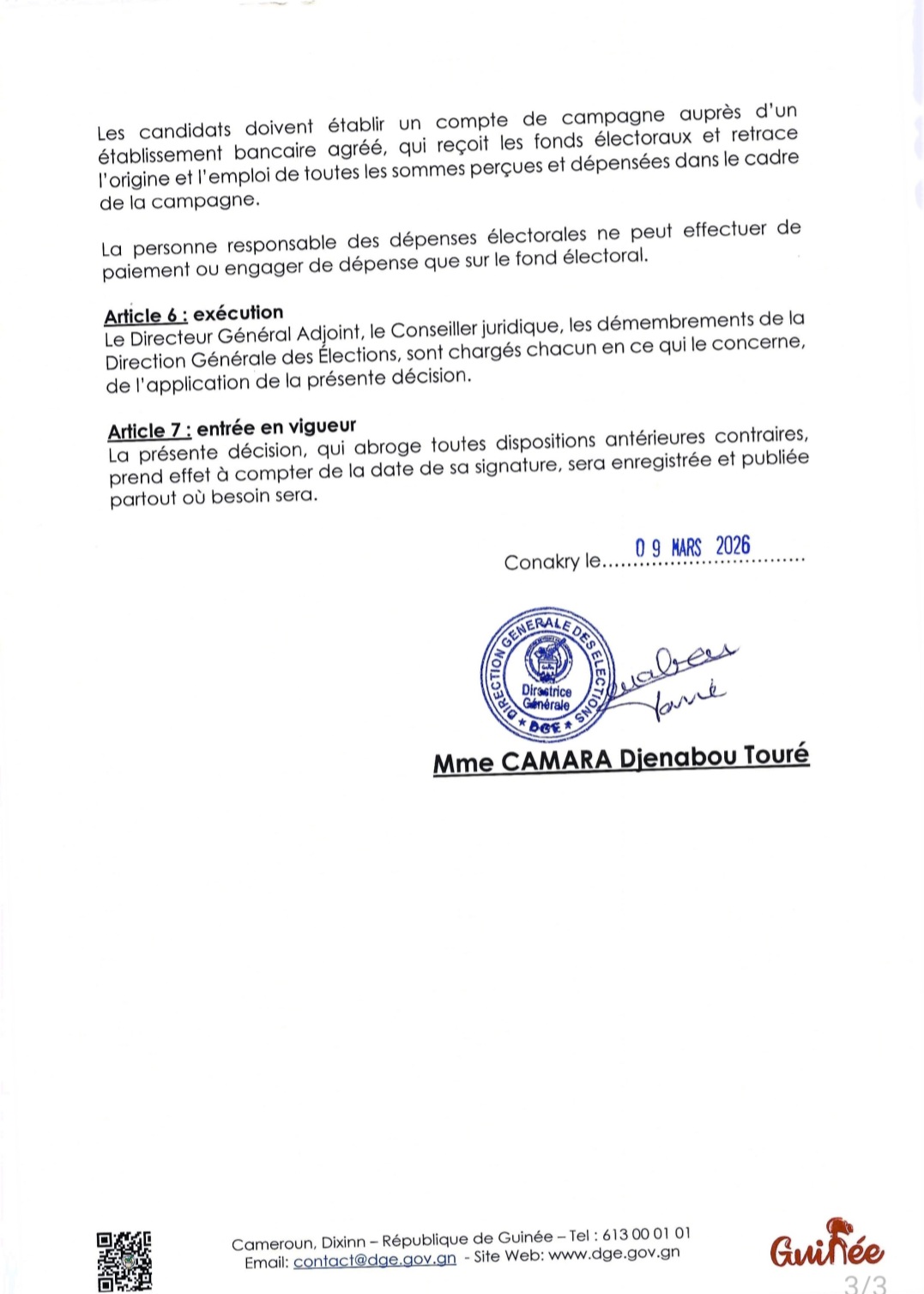 L’article 2 de la décision de la DGE stipule : “ En application de l’article 277 du code électoral, la caution prévue à l’article précédent doit être déposée au trésor public, cinquante (55) jours au plus tard avant la date des élections. Les cautions sont versées dans les comptes spécialement ouverts à cet effet auprès des démembrements de la Direction Générale des élections (DGE), dont les numéros sont communiqués aux candidats ou listes de candidats prenant part aux élections législatives et communales du 24 mai 2026”.