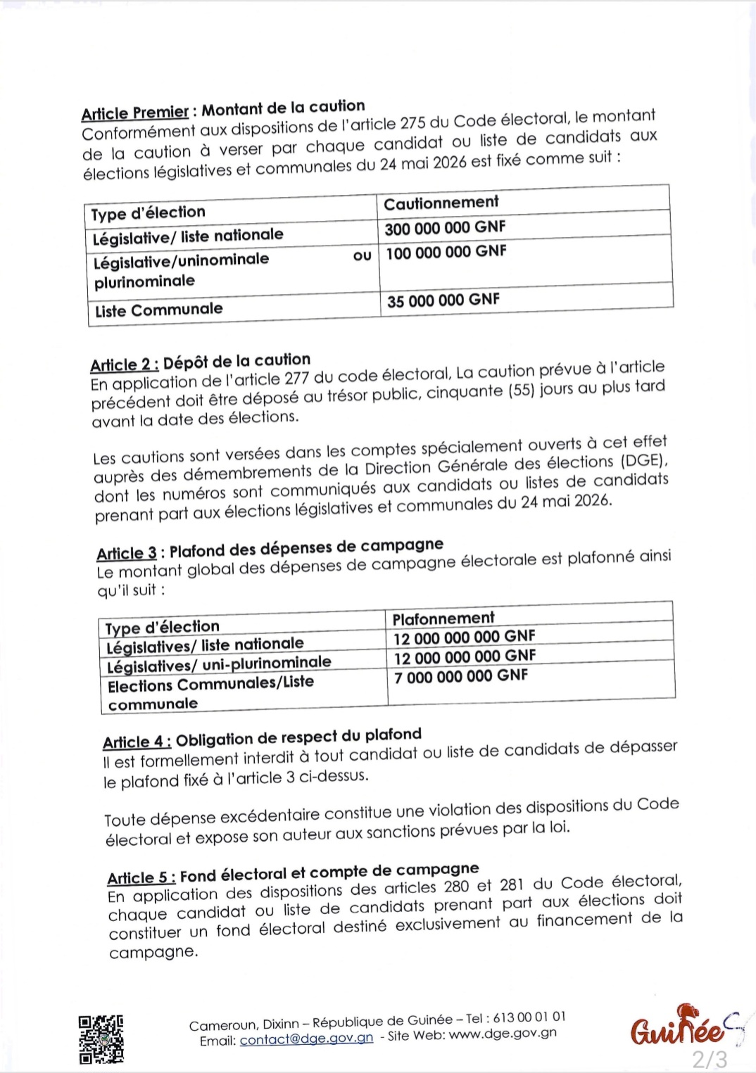 Liste législative (uninominale ou plurinominale) : 100 000 000 GNF