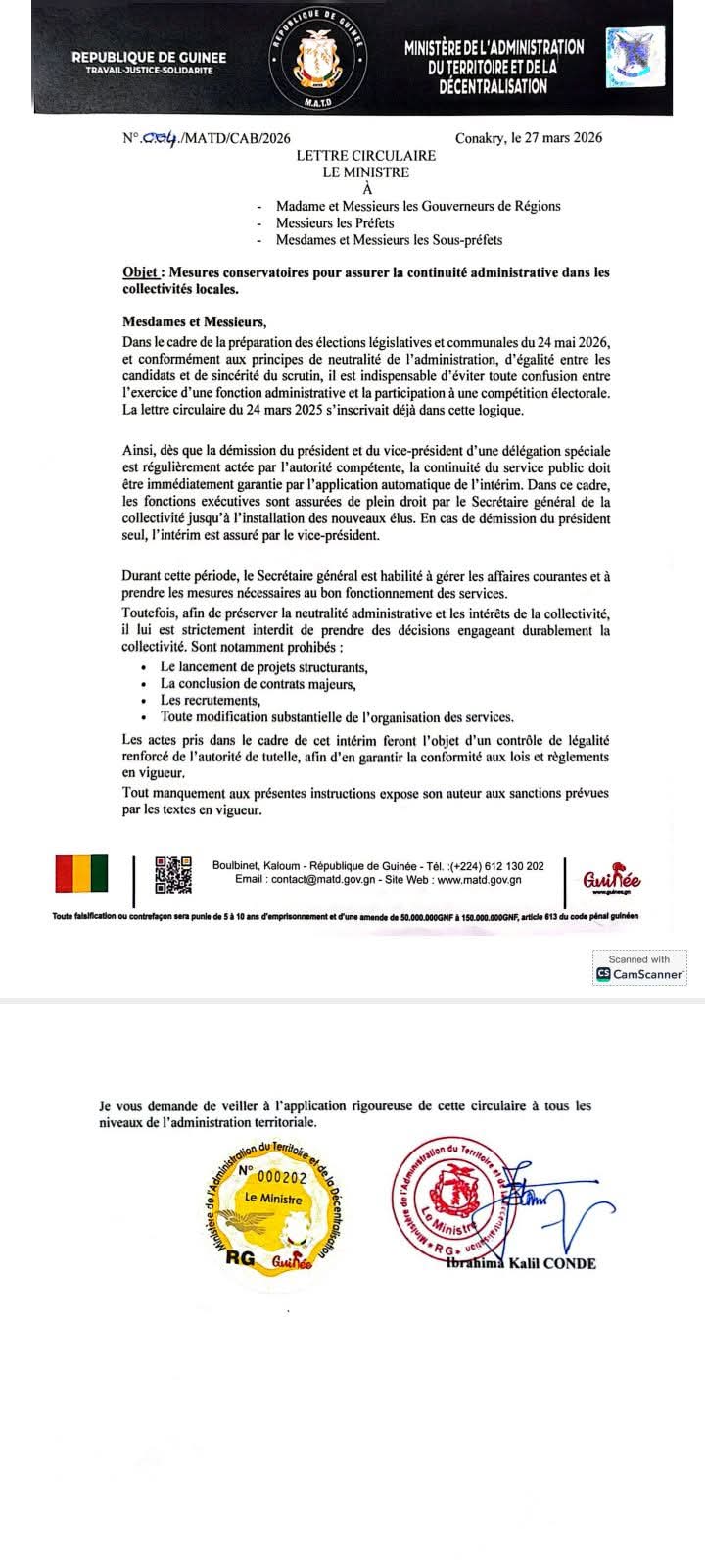 “Ainsi, dès que la démission du président et du vice-président d’une délégation spéciale est régulièrement actée par l’autorité compétente, la continuité du service public doit être immédiatement garantie par l’application automatique de l’intérim. Dans ce cadre, les fonctions exécutives sont assurćes de plein droit par le Secrétaire général de la collectivitế jusqu’à I’installation des nouveaux élus. En cas de démission du président seul, l’intérim est assuré par le vice-président”, précise la lettre circulaire.