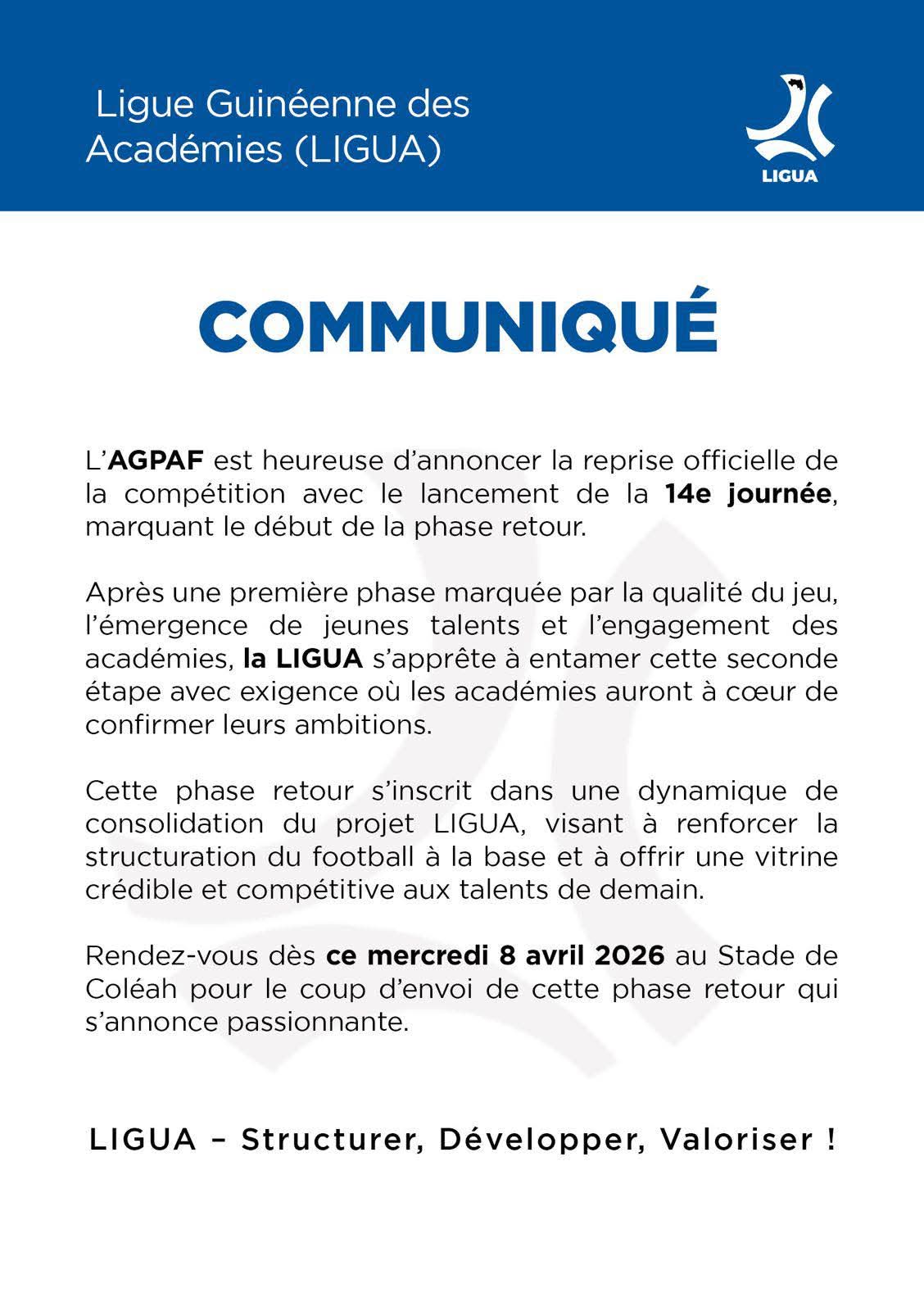 La phase retour de la Ligue guinéenne des académies (LIGUA) débute ce mercredi 8 avril 2026 au stade de Coléah. C’est l’annonce faite par l’Association guinéenne de promotion des académies de football (AGPAF) à travers un communiqué.