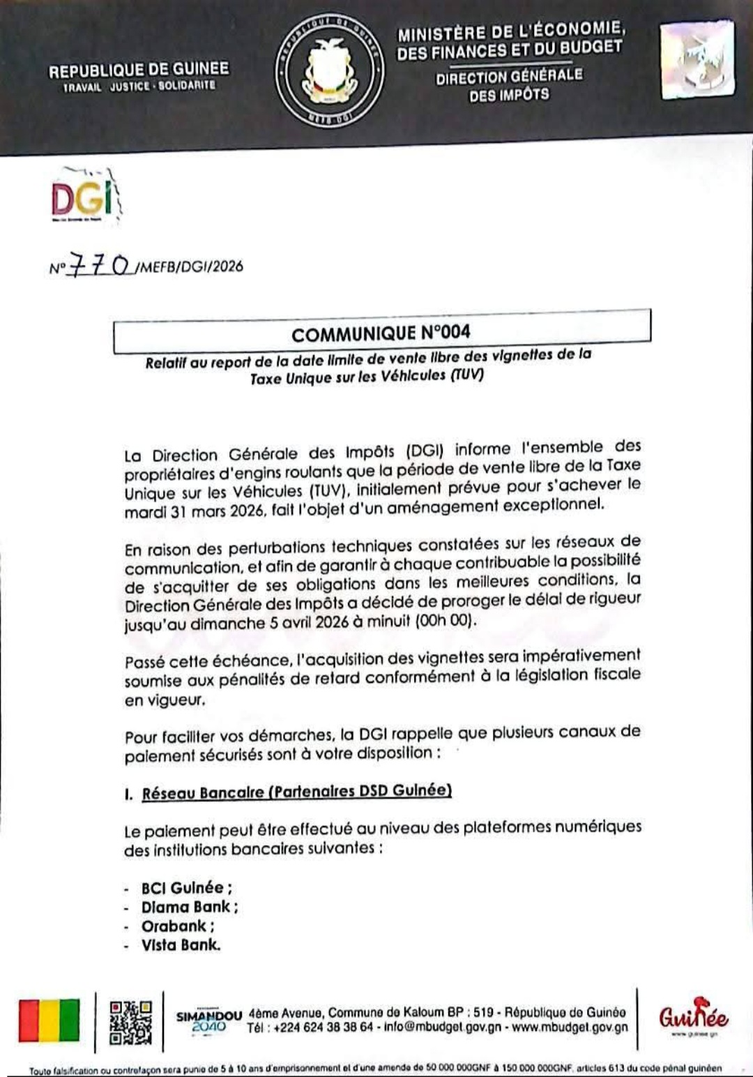 La Direction Générale des Impôts (DGI) a annoncé un report exceptionnel de la date limite de paiement de la Taxe Unique sur les Véhicules (TUV). Initialement fixée au 31 mars 2026, l’échéance est désormais prolongée jusqu’au dimanche 5 avril 2026 à minuit.