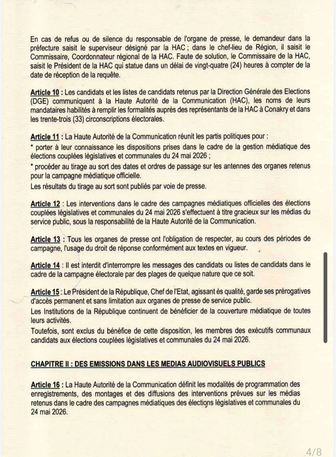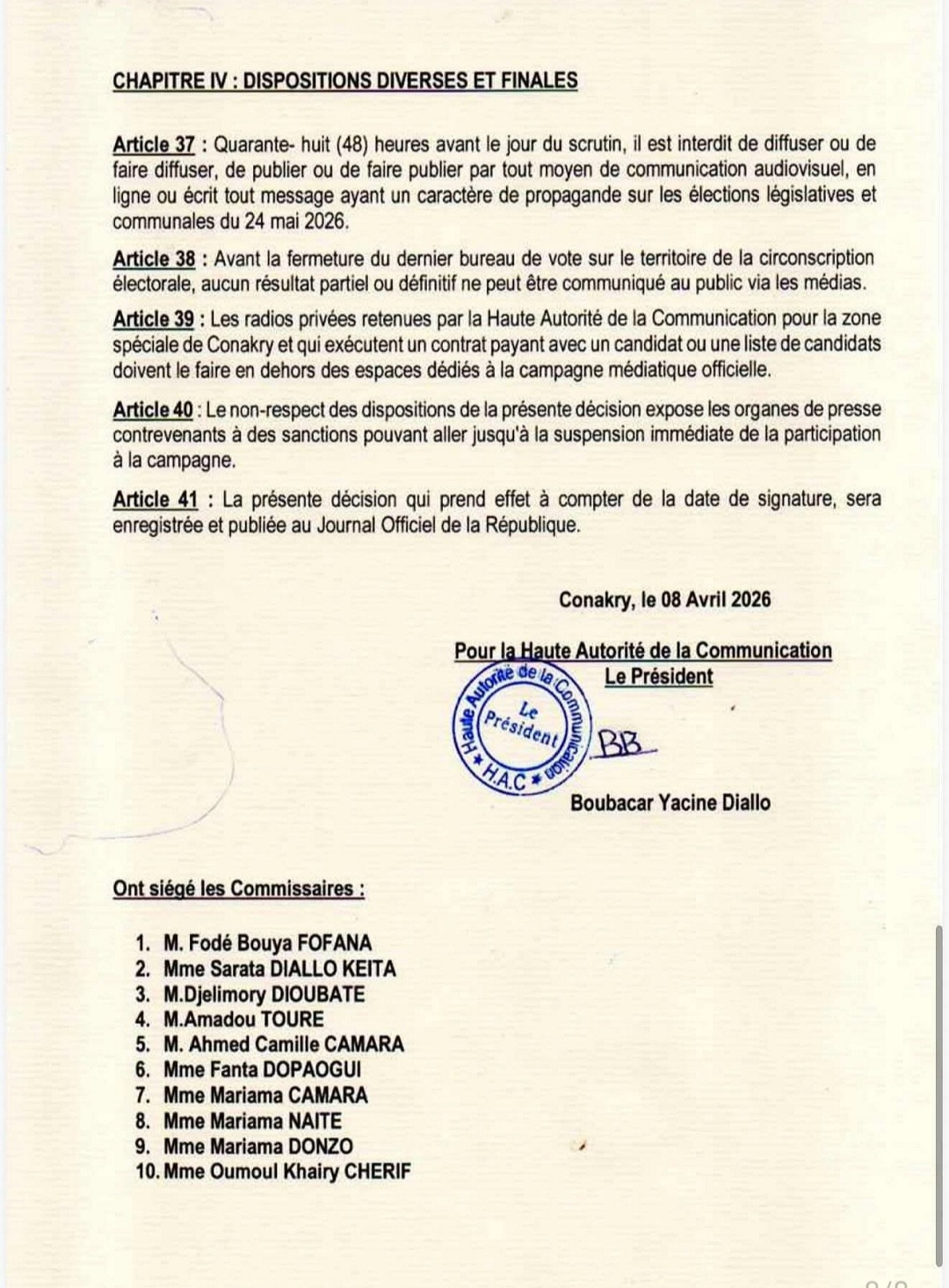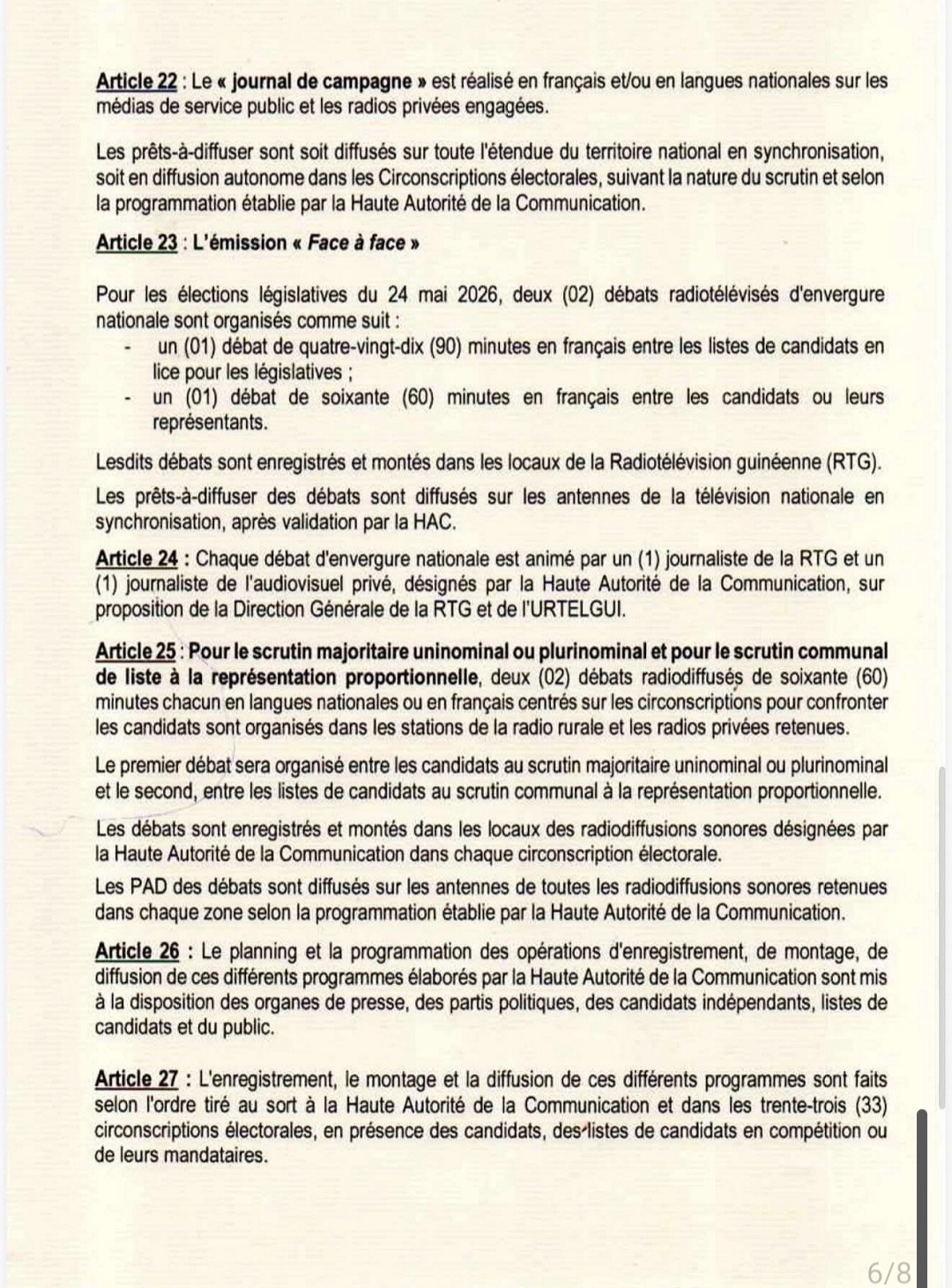 Selon la décision de la HAC, seuls les partis politiques reconnus par l’Etat, les candidats, listes de candidats aux élections législatives et communales du 24 mai 2026 officiellement retenus par la Direction Générale des élections (DGE) peuvent bénéficier de sa décision qui concerne contient 41 articles. Pour les détails consulter la décision ci-dessous.