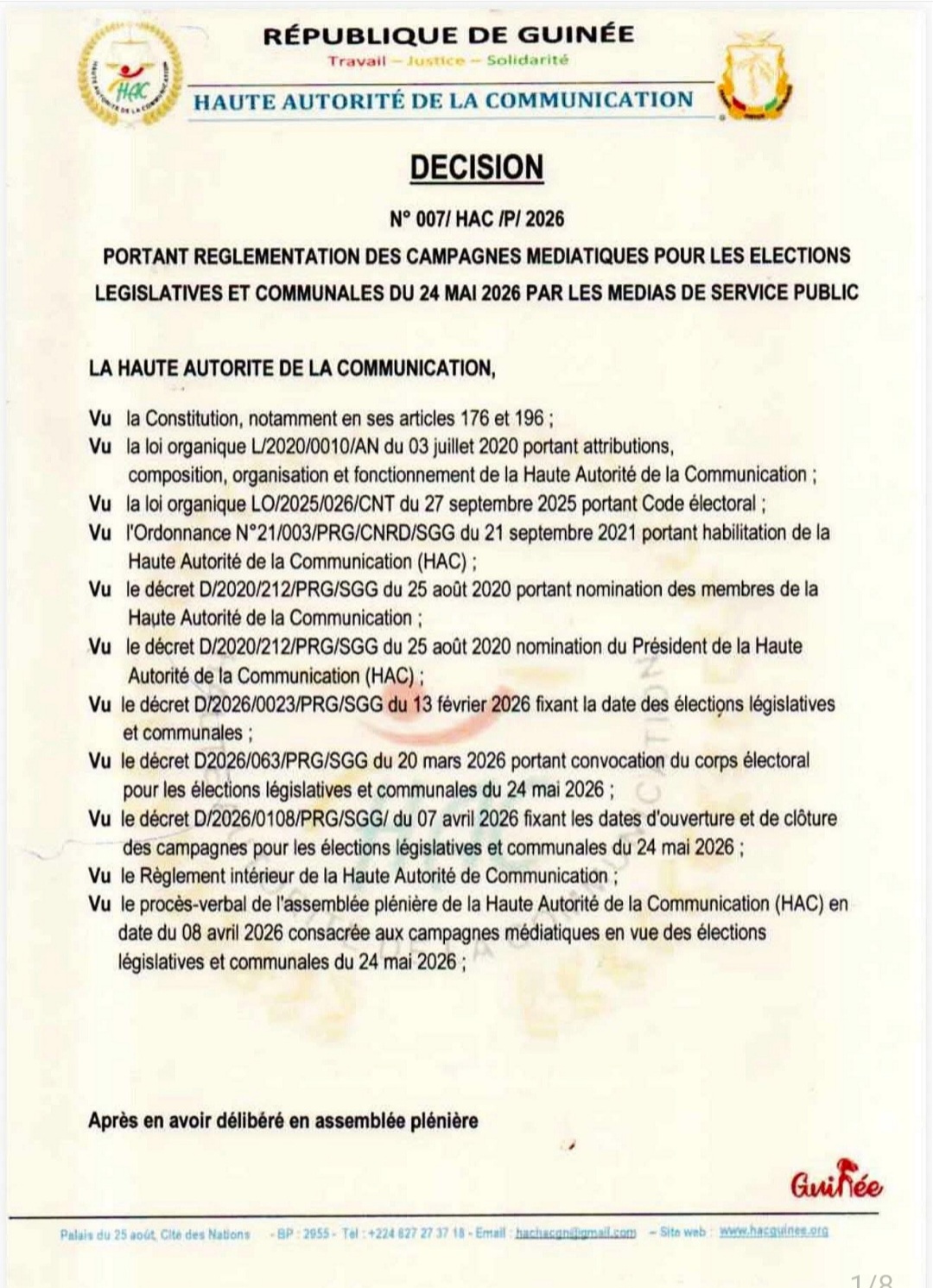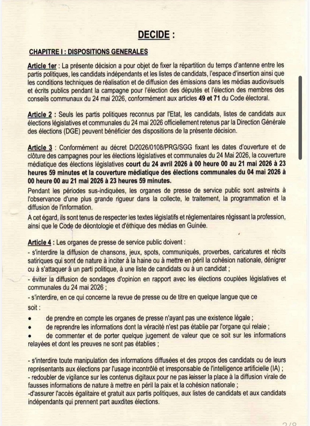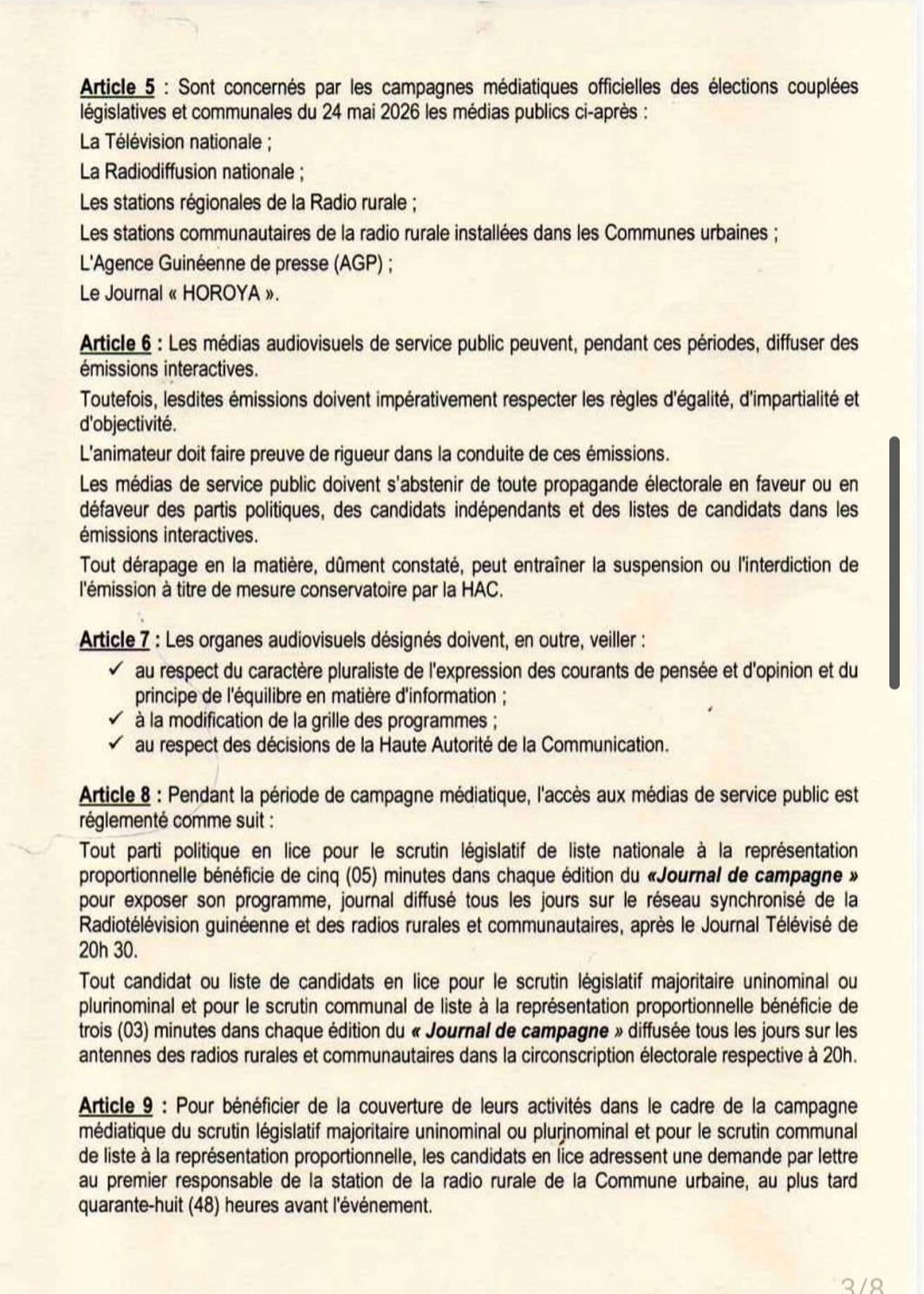 Selon la décision de la HAC, seuls les partis politiques reconnus par l’Etat, les candidats, listes de candidats aux élections législatives et communales du 24 mai 2026 officiellement retenus par la Direction Générale des élections (DGE) peuvent bénéficier de sa décision qui concerne contient 41 articles. Pour les détails consulter la décision ci-dessous.
