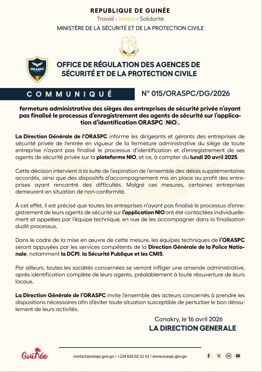 La Direction générale de l’Office de régulation des agences de sécurité et de la protection civile (ORASPC) durcit le ton. Dans un communiqué officiel publié ce 16 avril 2026, l’institution annonce la fermeture administrative des sièges des entreprises de sécurité privée n’ayant pas finalisé le processus d’enregistrement de leurs agents sur la plateforme d’identification NIO.