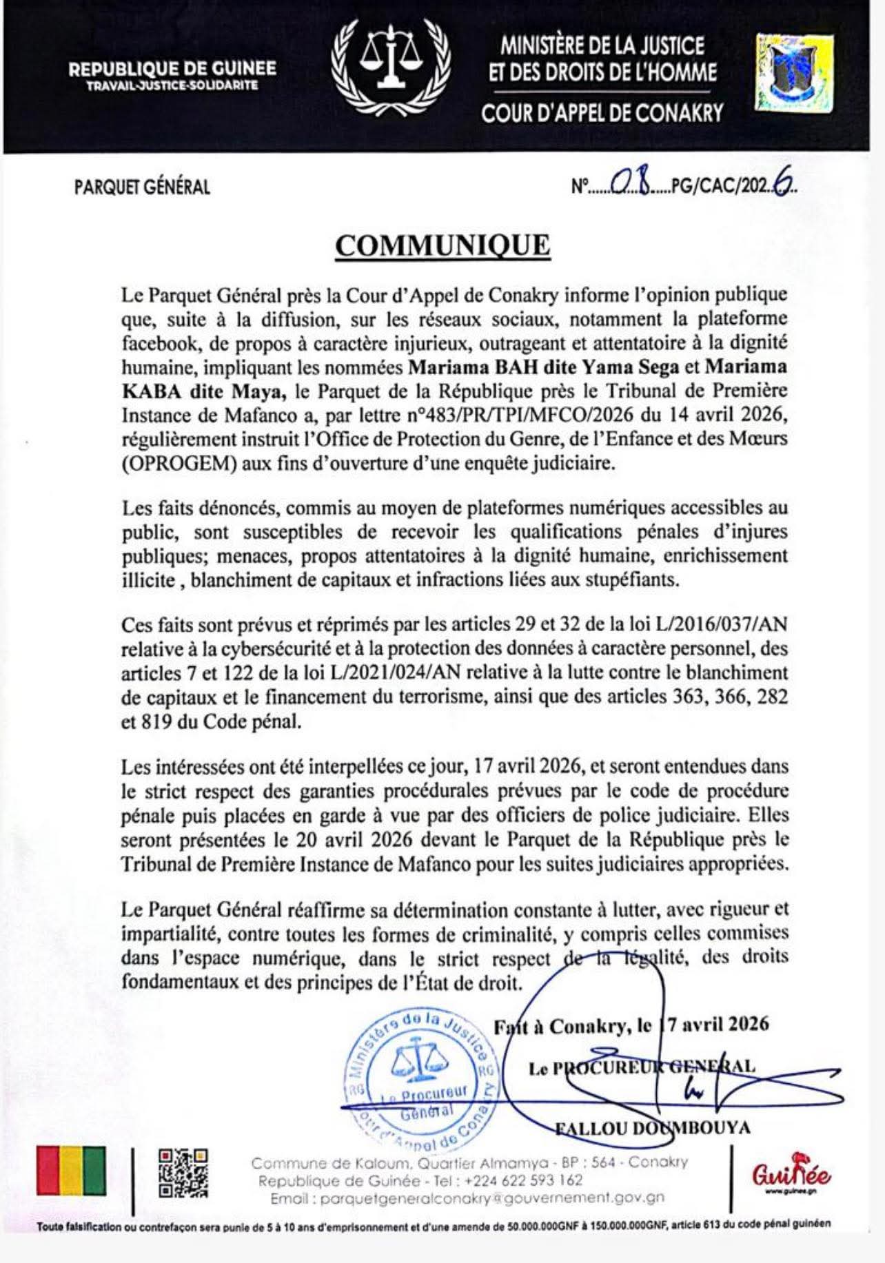 Selon le document, le Parquet de la République près le Tribunal de première instance de Mafanco avait déjà, par correspondance en date du 14 avril 2026, instruit l’Office de protection du genre, de l’enfance et des mœurs (OPROGEM) d’ouvrir une enquête judiciaire sur cette affaire.