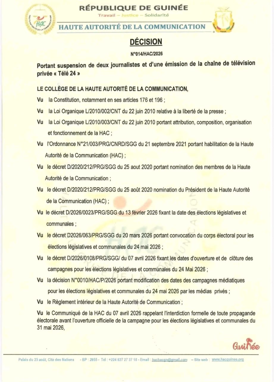 Dans son acte, la HAC rappelle le cadre légal régissant la liberté de la presse et l’exercice du journalisme en Guinée, notamment en période électorale. Elle souligne que la chaîne Télé 24 avait déjà fait l’objet d’un avertissement après la diffusion, le 21 avril 2026, d’un reportage d’origine amateur mettant en avant des activités de propagande en faveur d’un candidat.