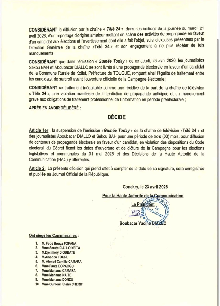 La HAC indique que lors de l’émission “Guinée Today” diffusée le jeudi 23 avril 2026, les journalistes Sékou Bah et Aboubacar Diallo se sont livrés à des pratiques assimilées à de la propagande électorale en faveur d’un candidat dans la commune rurale de Kollet, préfecture de Tougué.